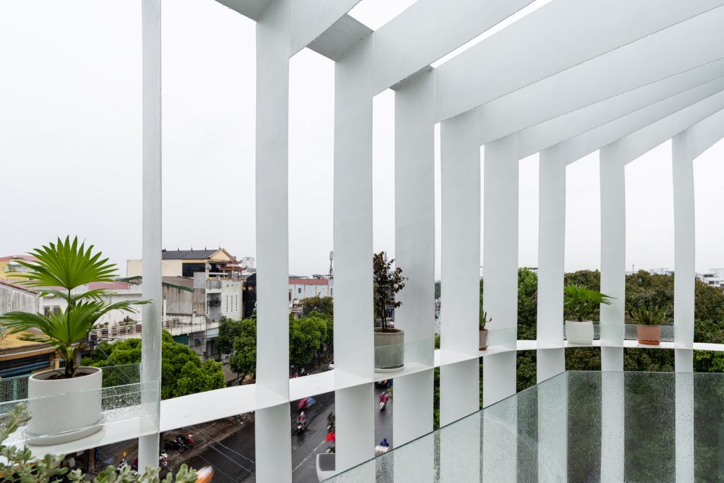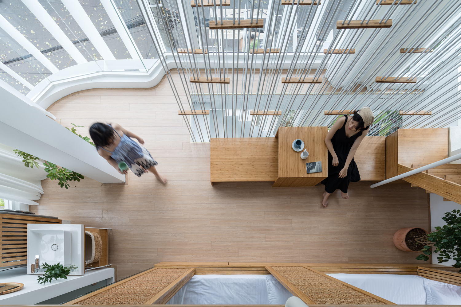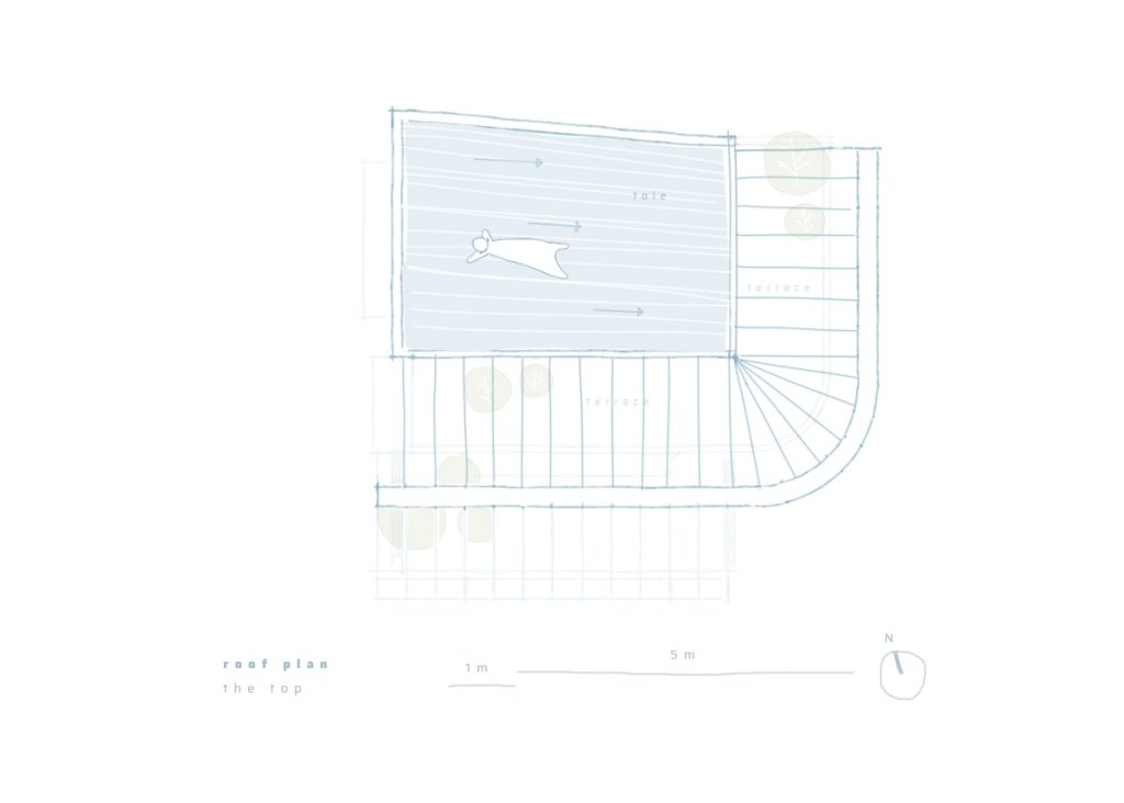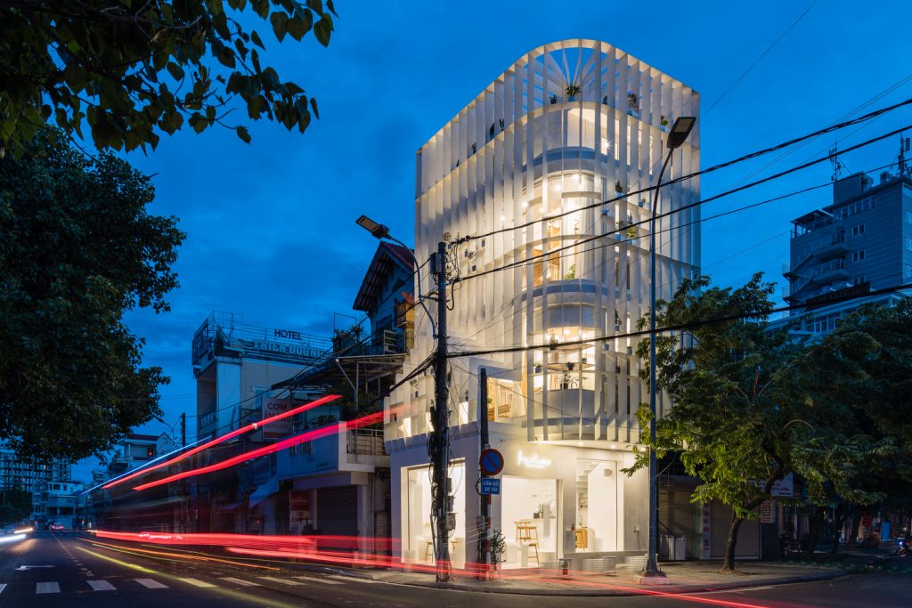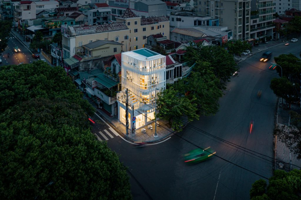 Tiam có ba tầng, một gác mái, ban công và sân thượng. Tầng đầu tiên dành cho quán cà phê, được điều hành bởi gia chủ, và phần còn lại của tòa nhà là để sống. Các cửa sổ dọc và tường thủy tinh bao phủ ngôi nhà giống như một phân vùng mơ hồ giữa “vào và ra”, đưa mọi người vào trong ngôi nhà gần gũi với thiên nhiên và ra với những người khác trên đường phố.
