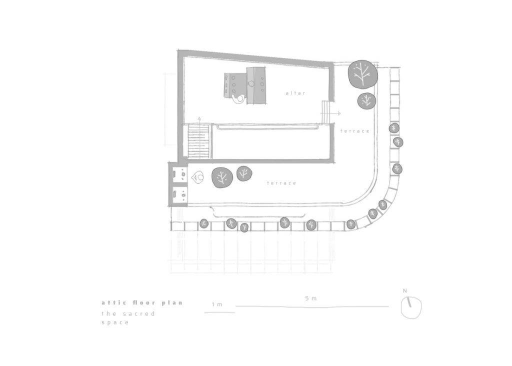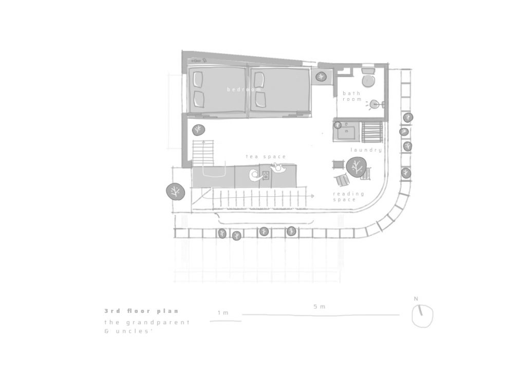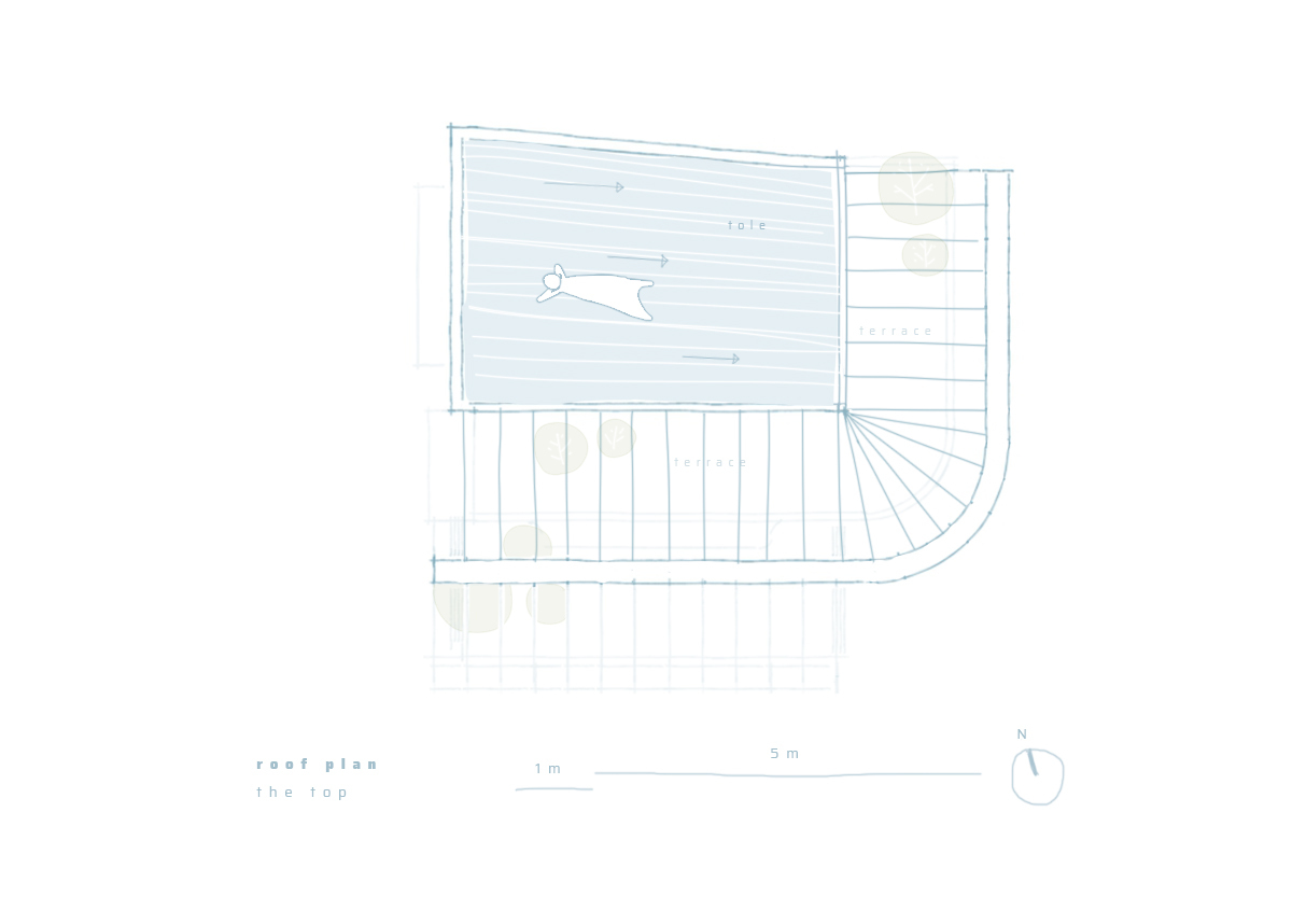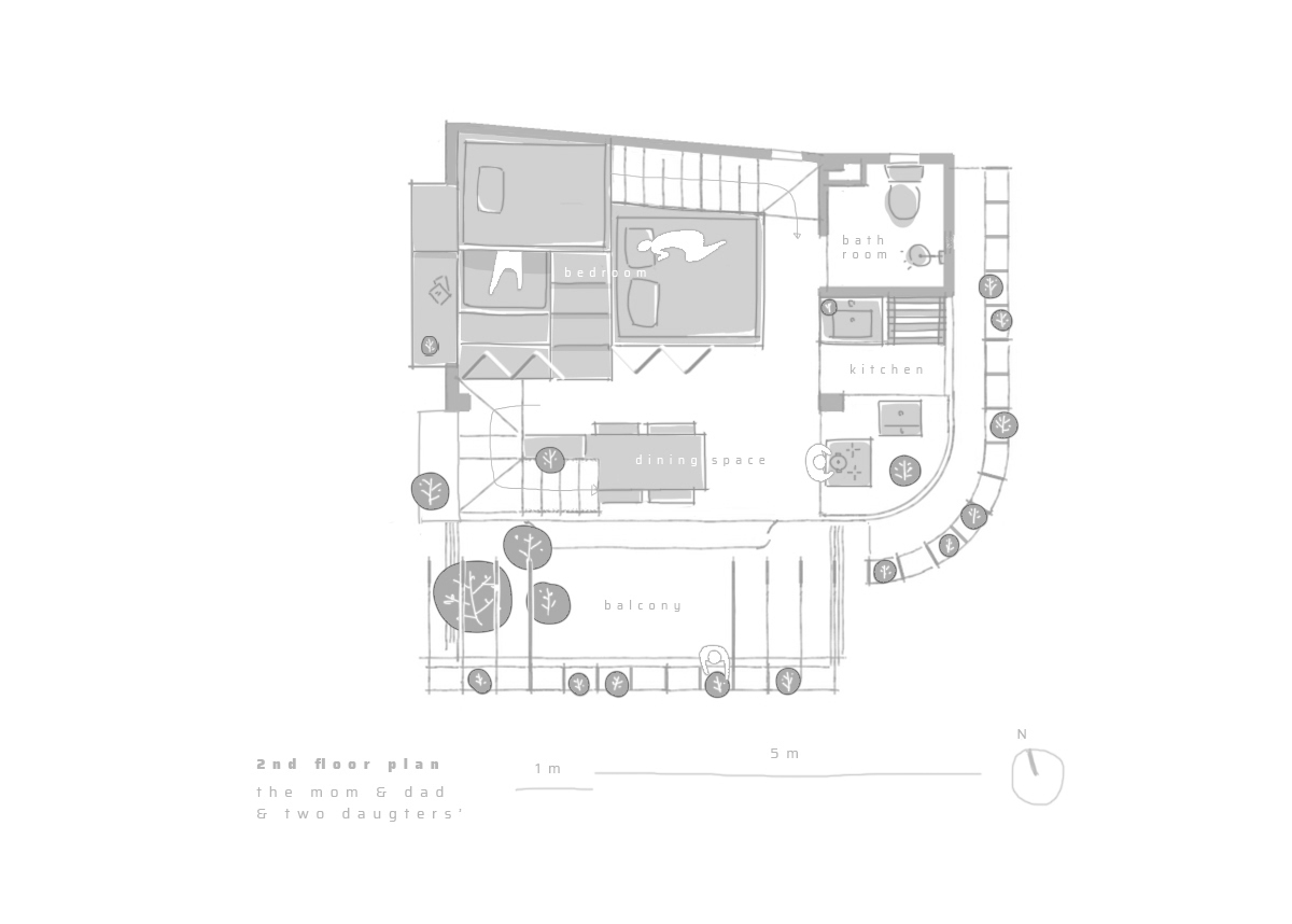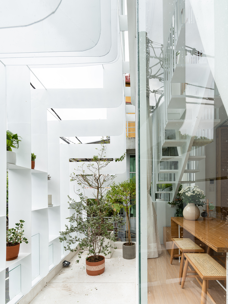 Tiam có ba tầng, một gác mái, ban công và sân thượng. Tầng đầu tiên dành cho quán cà phê, được điều hành bởi gia chủ, và phần còn lại của tòa nhà là để sống. Các cửa sổ dọc và tường thủy tinh bao phủ ngôi nhà giống như một phân vùng mơ hồ giữa “vào và ra”, đưa mọi người vào trong ngôi nhà gần gũi với thiên nhiên và ra với những người khác trên đường phố.