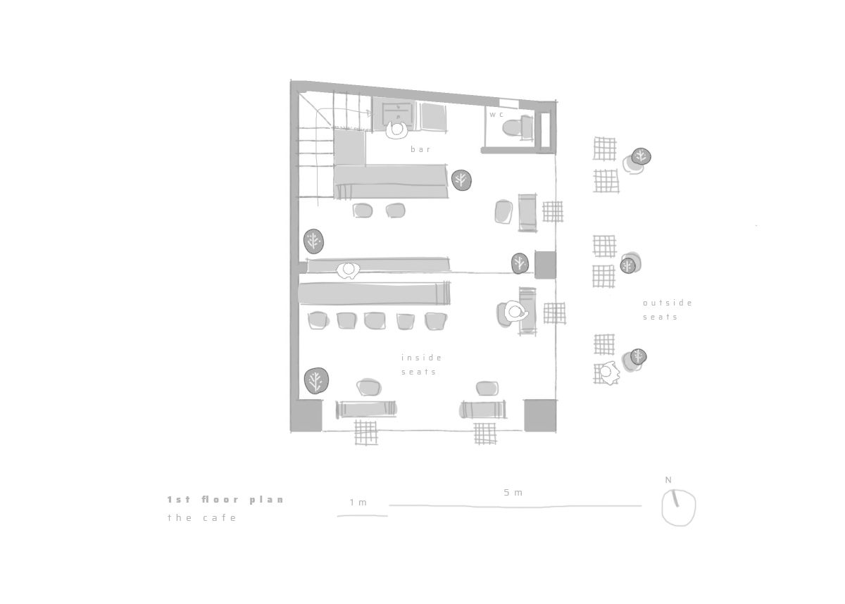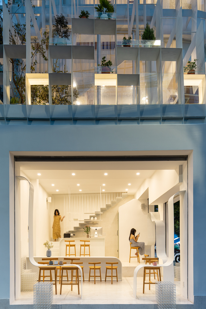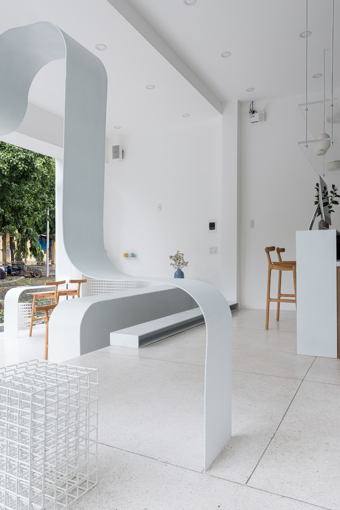 Quán cà phê ở tầng một được thiết kế với các yếu tố và vật liệu giống như phần còn lại của ngôi nhà. Bàn cong dài, ghế mỏng và trong suốt được đặt trong một không gian tối thiểu và đơn sắc như vậy làm cho tất cả các vật thể đầy màu sắc khác đáng chú ý. Hơn nữa, sự xuất hiện của những người khách uống nước và trò chuyện trong quán làm cho nó trở thành một khung cảnh sống động và tươi đẹp.