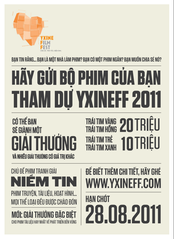 Tiệc phim ngắn trực tuyến YxineFF (Yxine Film Fest) diễn ra tại địa chỉ www.yxineff.com. Với tiêu chí “Chia sẻ. Tình yêu. Điện ảnh.”, các nhà làm phim và khán giả yêu mến điện ảnh độc lập là đối tượng YxineFF hướng đến. YxineFF lần thứ hai với chủ đề NIỀM TIN chính thức bắt đầu ngày 29.5.2011 và kéo dài trong 7 tháng.
