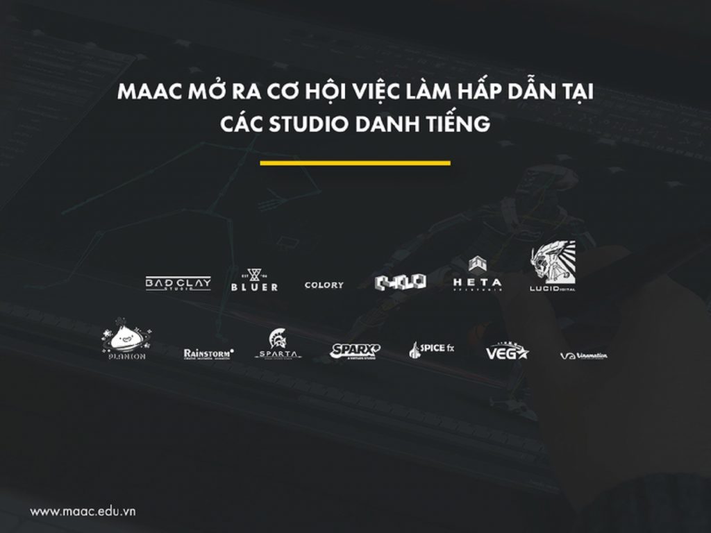 Học viện MAAC là nơi gắn kết cộng đồng các đơn vị Truyền thông và Giải trí hiện nay tại Việt Nam như: SPARX*, SPARTA VFX, LuciDigital, ALIEN Media, ory Animation, Cyclo, SPICE fx, VEGA Animation Studio, Bad Clay,… Mang lại cơ hội việc làm dồi dào, tạo điều kiện để học viên thử sức với những dự án lớn. Đây là bước đệm vững chắc để các bạn có thể trở thành một chuyên gia trong giới kỹ xảo điện ảnh và hoạt hình tại Việt Nam.