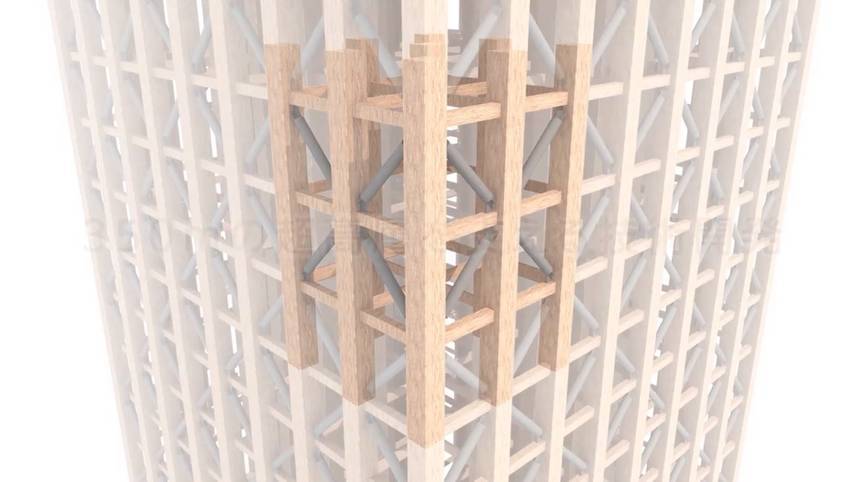 Gỗ dự kiến sẽ chiếm 90% trong cấu trúc tòa nhà, với 185.000 mét khối gỗ được lên kế hoạch sử dụng trong quá trình xây dựng. Tòa nhà sẽ sử dụng một “cấu trúc ống giằng” với các cột và dầm được làm từ thép và gỗ, được hỗ trợ bằng các thanh giằng thép chéo bổ sung.