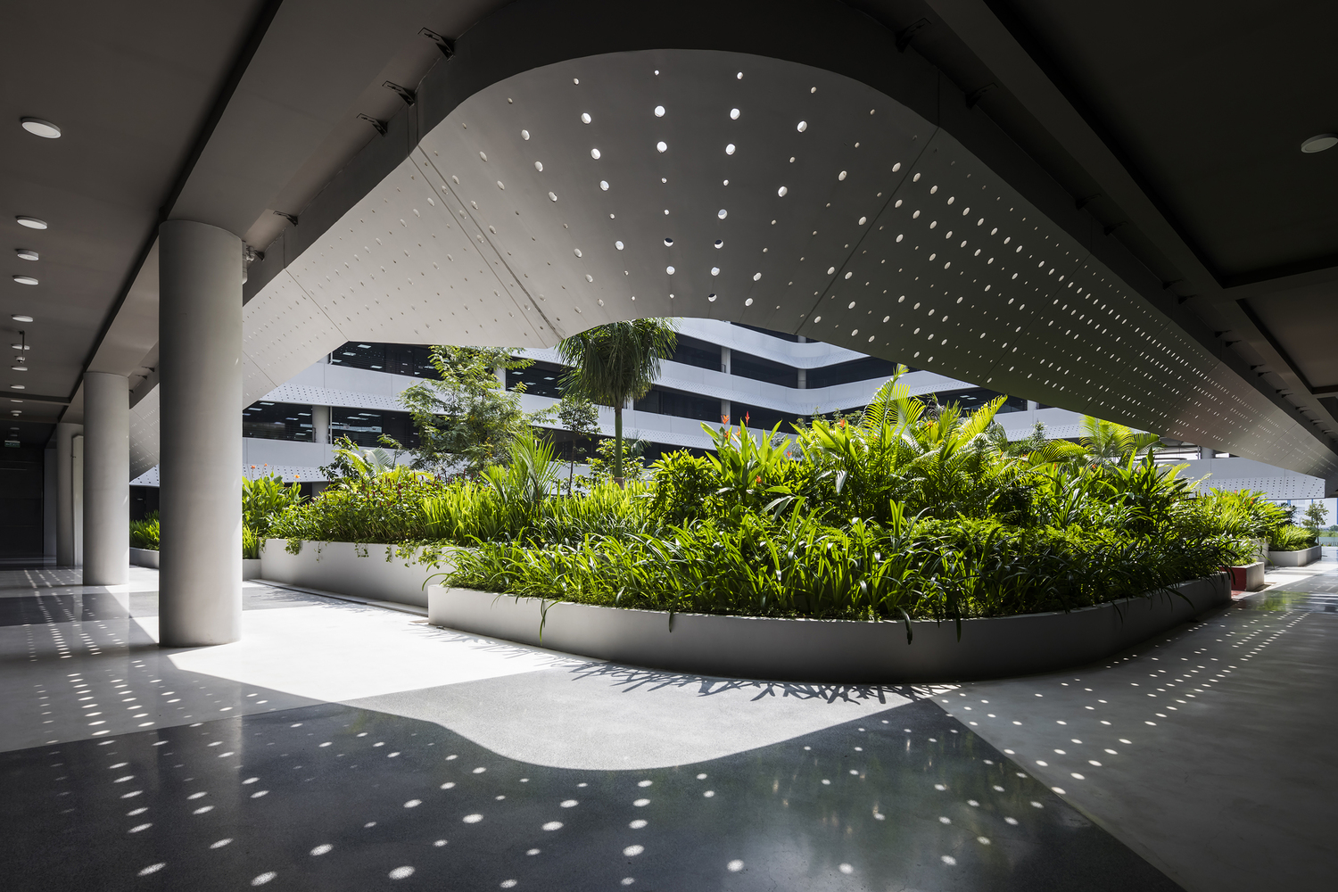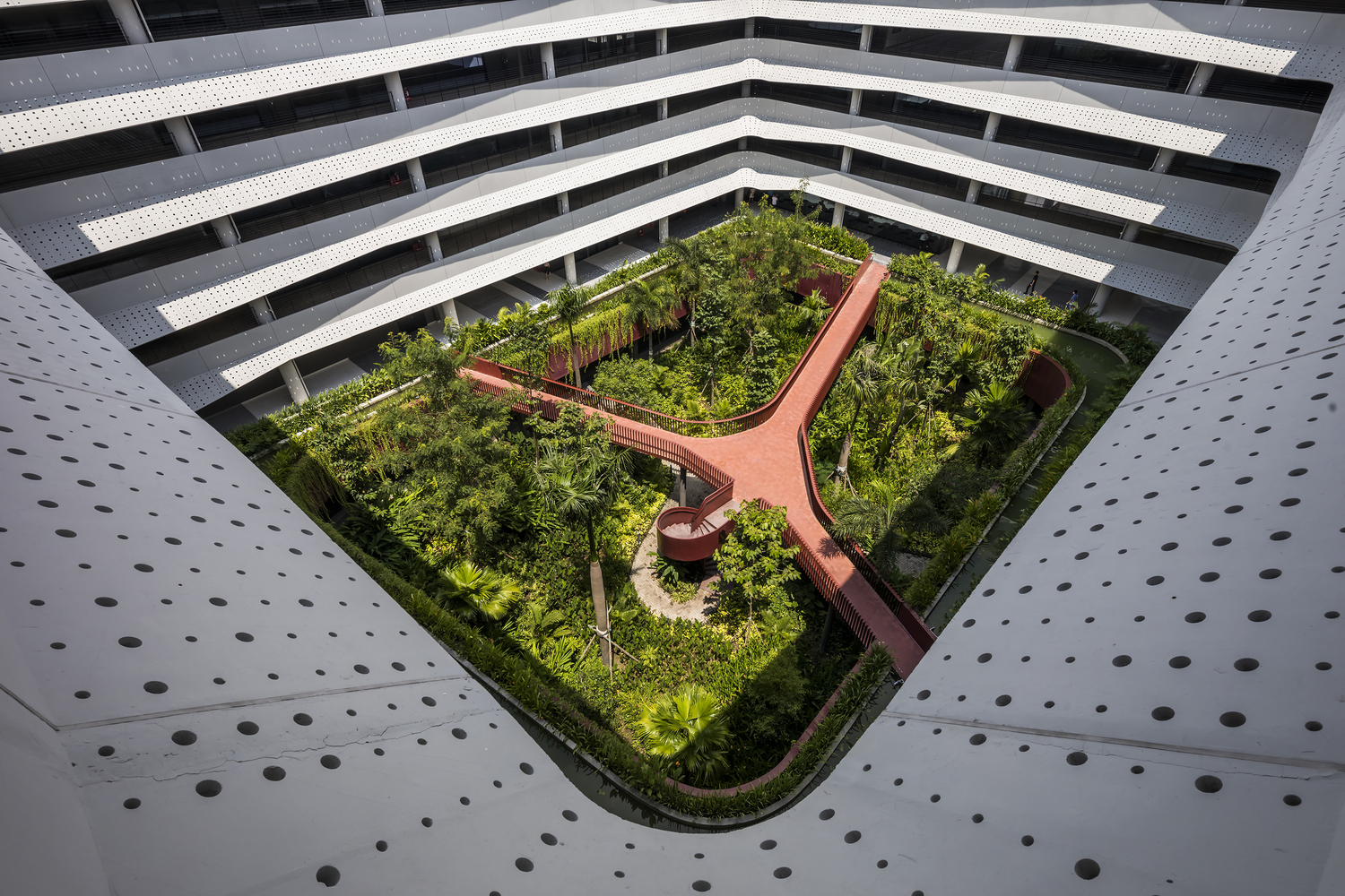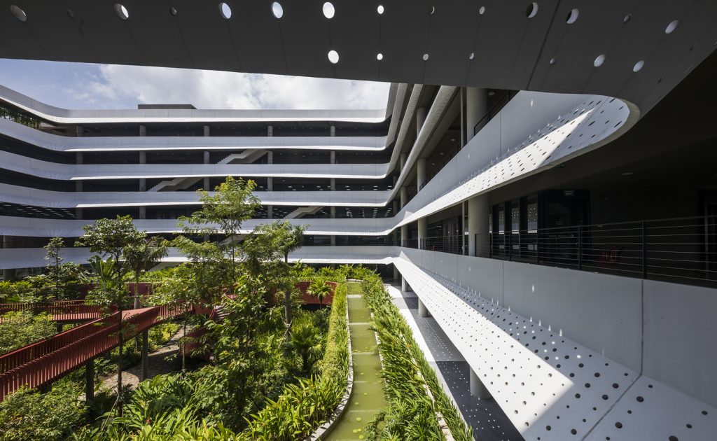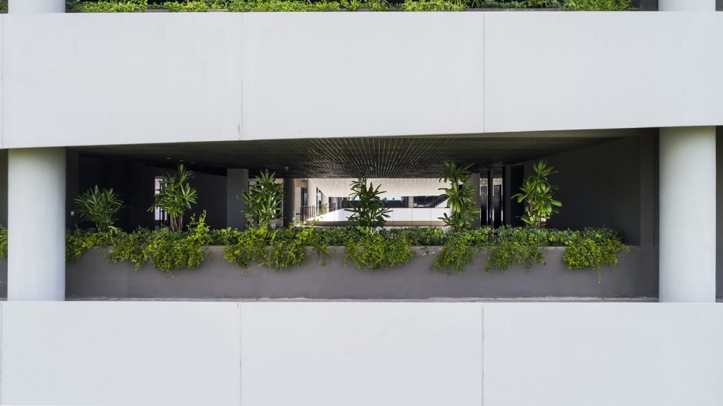 Thiết kế thông thoáng, đón gió trời góp phần làm mát toàn bộ không gian bên trong. Mảng xanh ở trung tâm đóng vai trò lọc không khí, giữ ẩm và thấm nước mưa.