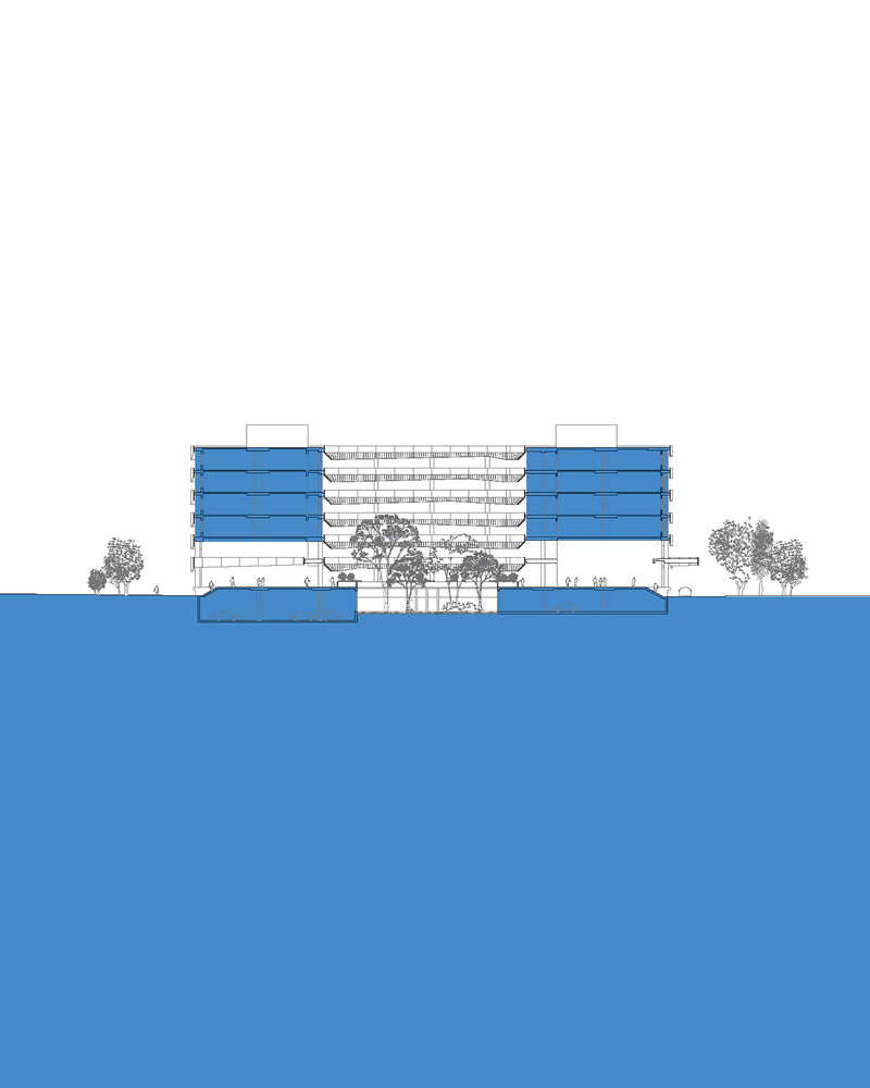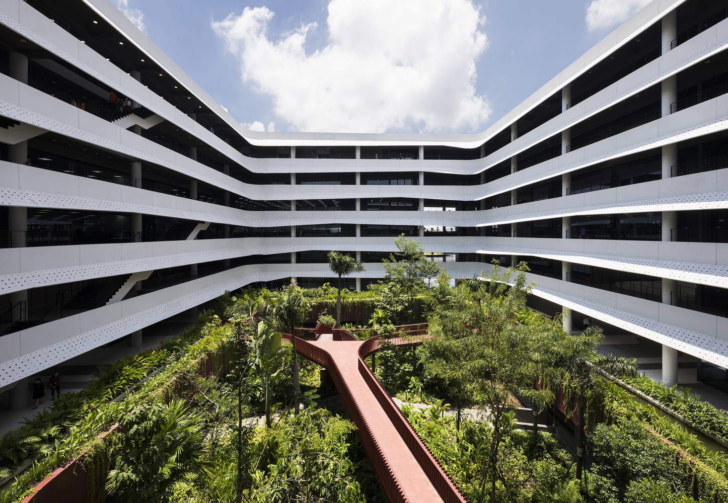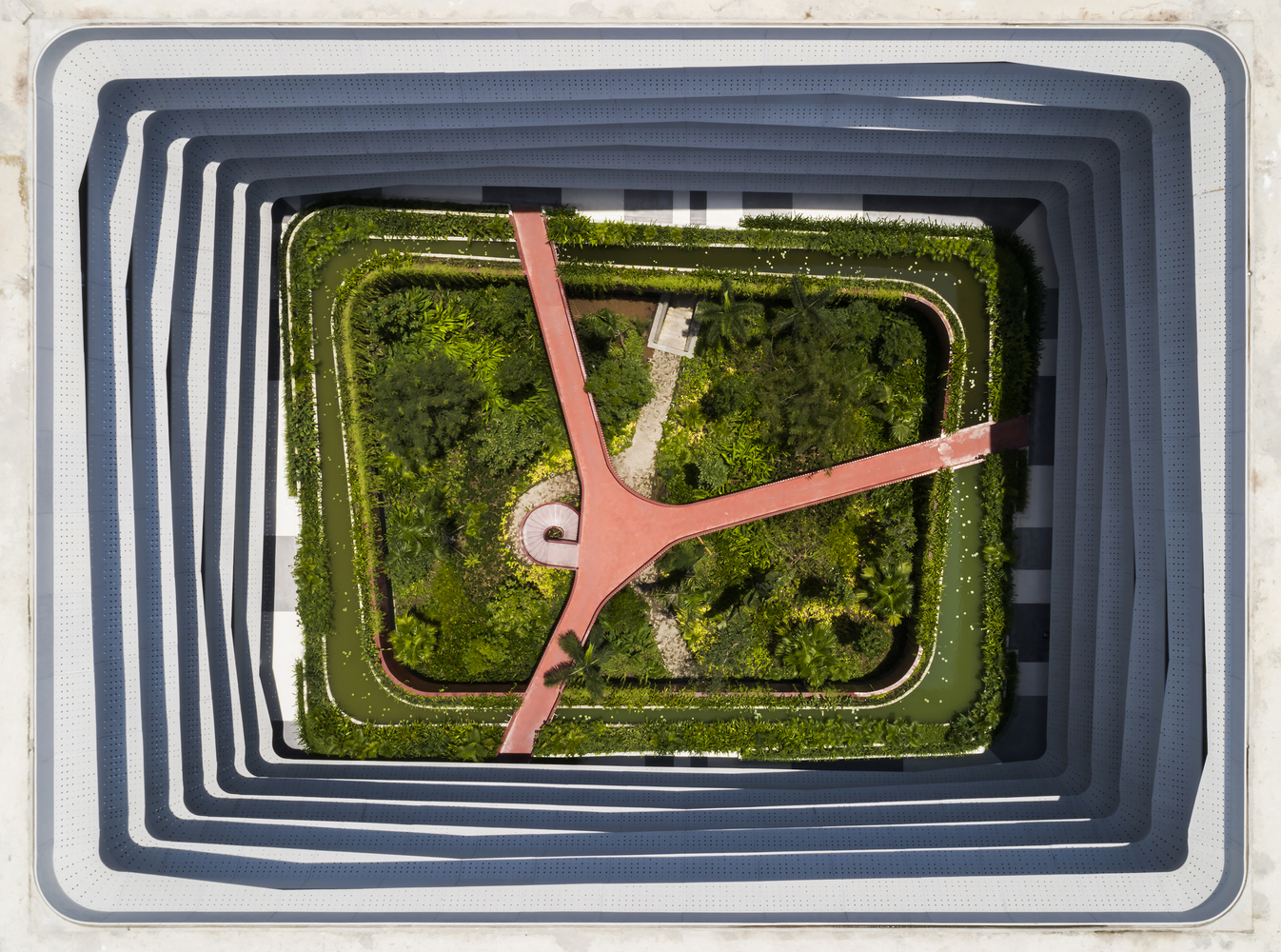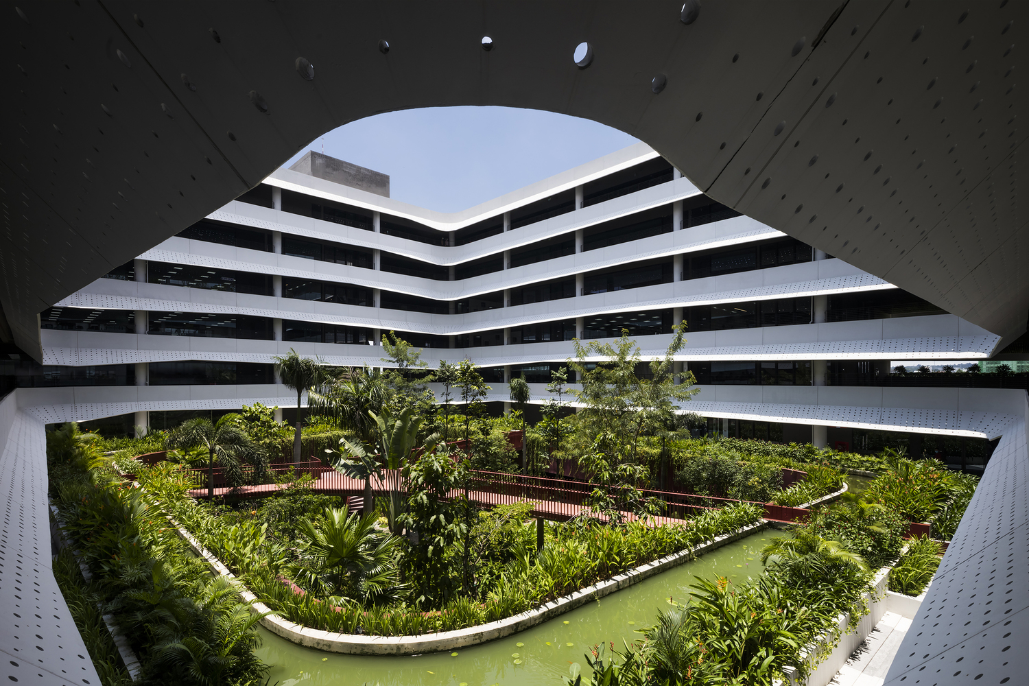 Thiết kế thông thoáng, đón gió trời góp phần làm mát toàn bộ không gian bên trong. Mảng xanh ở trung tâm đóng vai trò lọc không khí, giữ ẩm và thấm nước mưa.