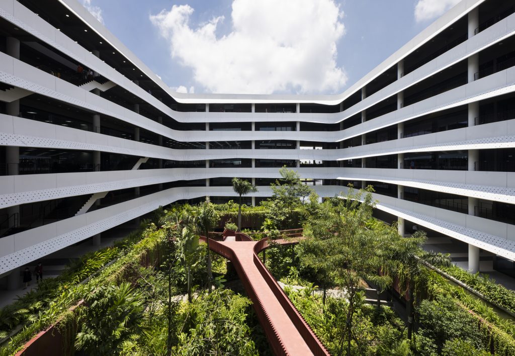Mượn ý tưởng từ khu rừng nhiệt đới và mong muốn sống chan hòa với thiên nhiên, công ty phần mềm hàng đầu Việt Nam FPT Software tận dụng phong cách kiến trúc để mang đến một môi trường làm việc sáng tạo, thoải mái và bền vững cho nhân viên. Đây cũng là xu hướng xây dựng của những đại bản doanh công nghệ tại thung lũng Silicon lừng danh.