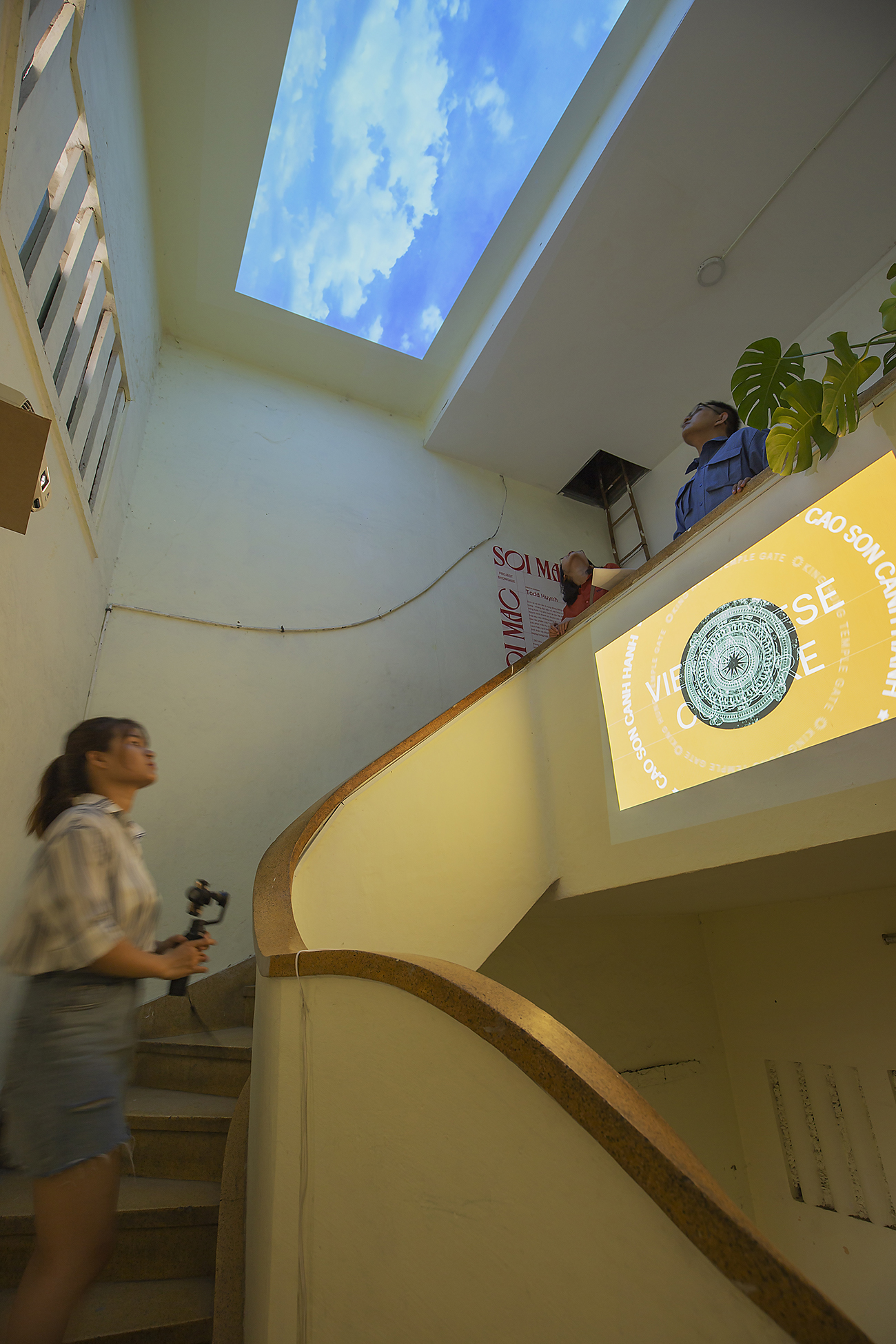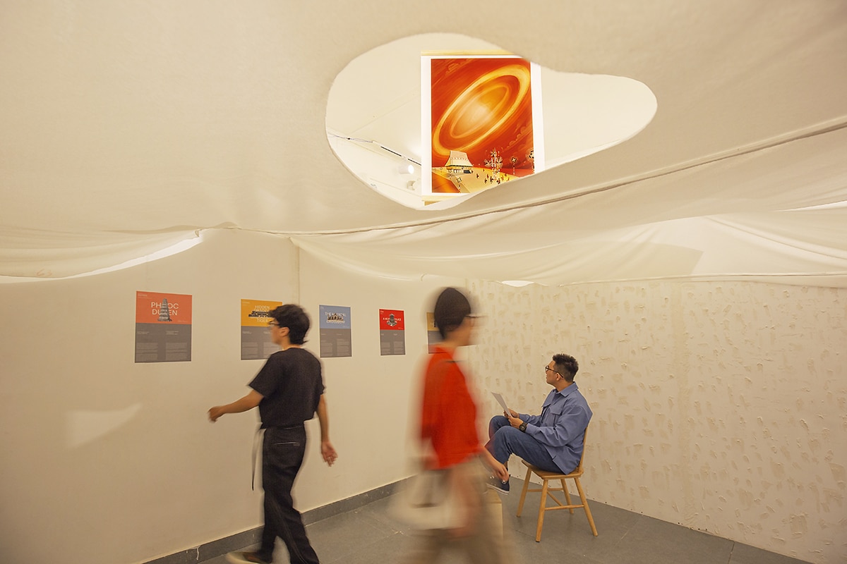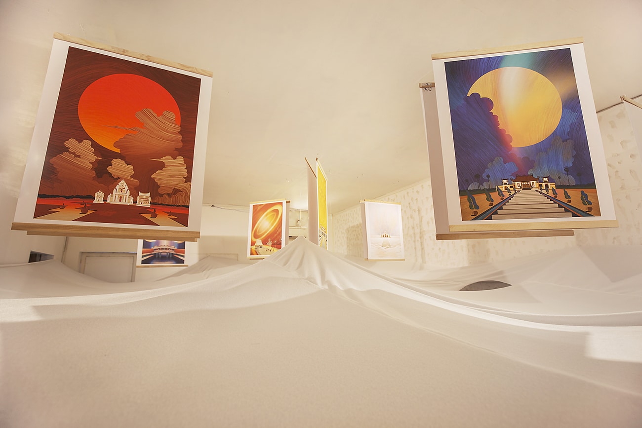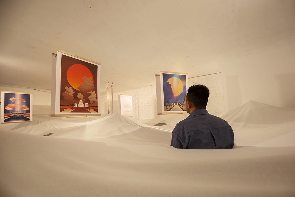 Đối lập với 12 bức giới thiệu thông tin của các công trình theo ảnh trắng đen, ở không gian trưng bày, Todd và team Monosketch cho người xem được “cách ly khỏi mặt đất” và bay trên mây với các tác phẩm được vẽ lại theo phong cách vị lai, siêu thực, đi kèm cùng các điển tích, câu chuyện đằng sau từng công trình.