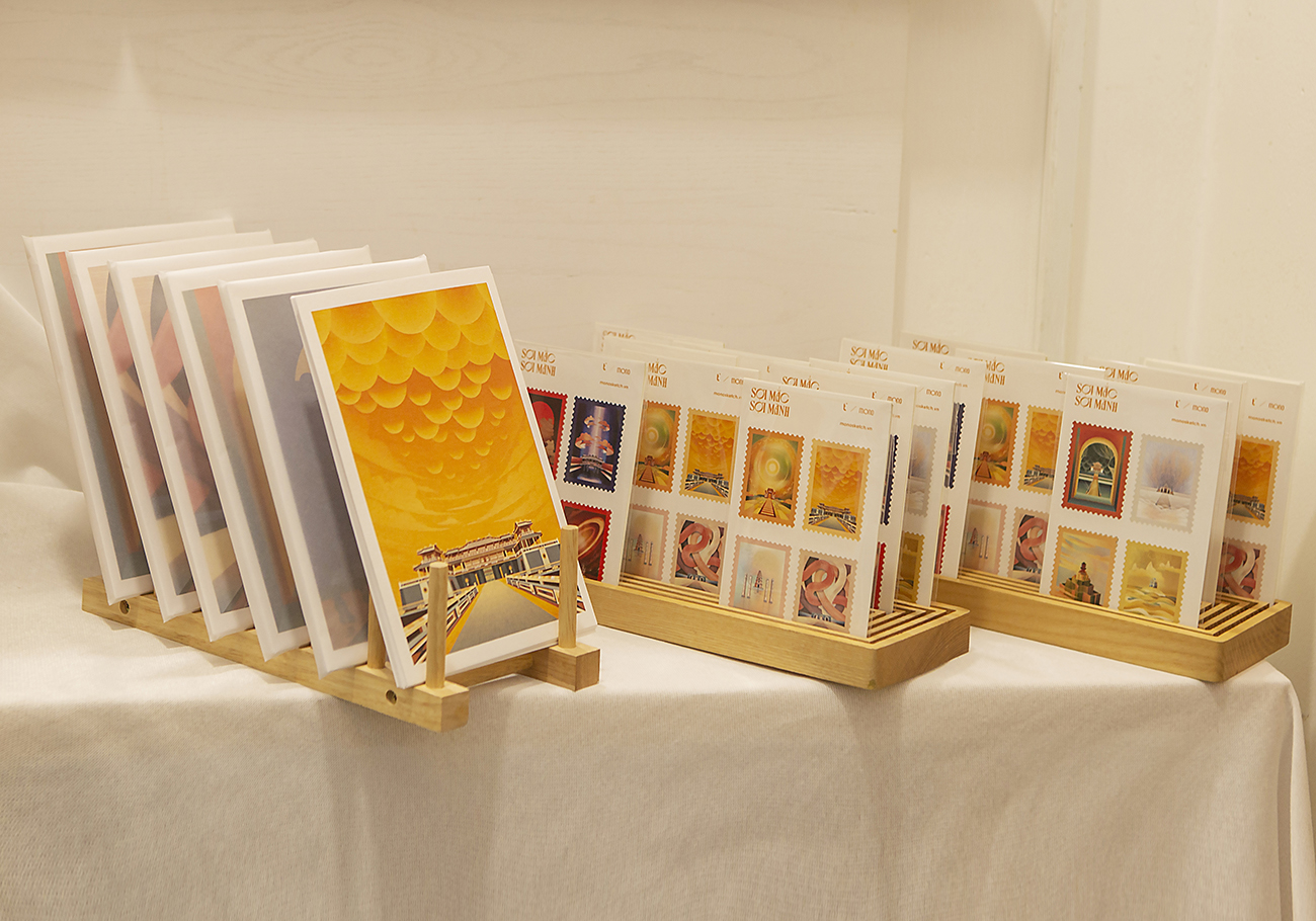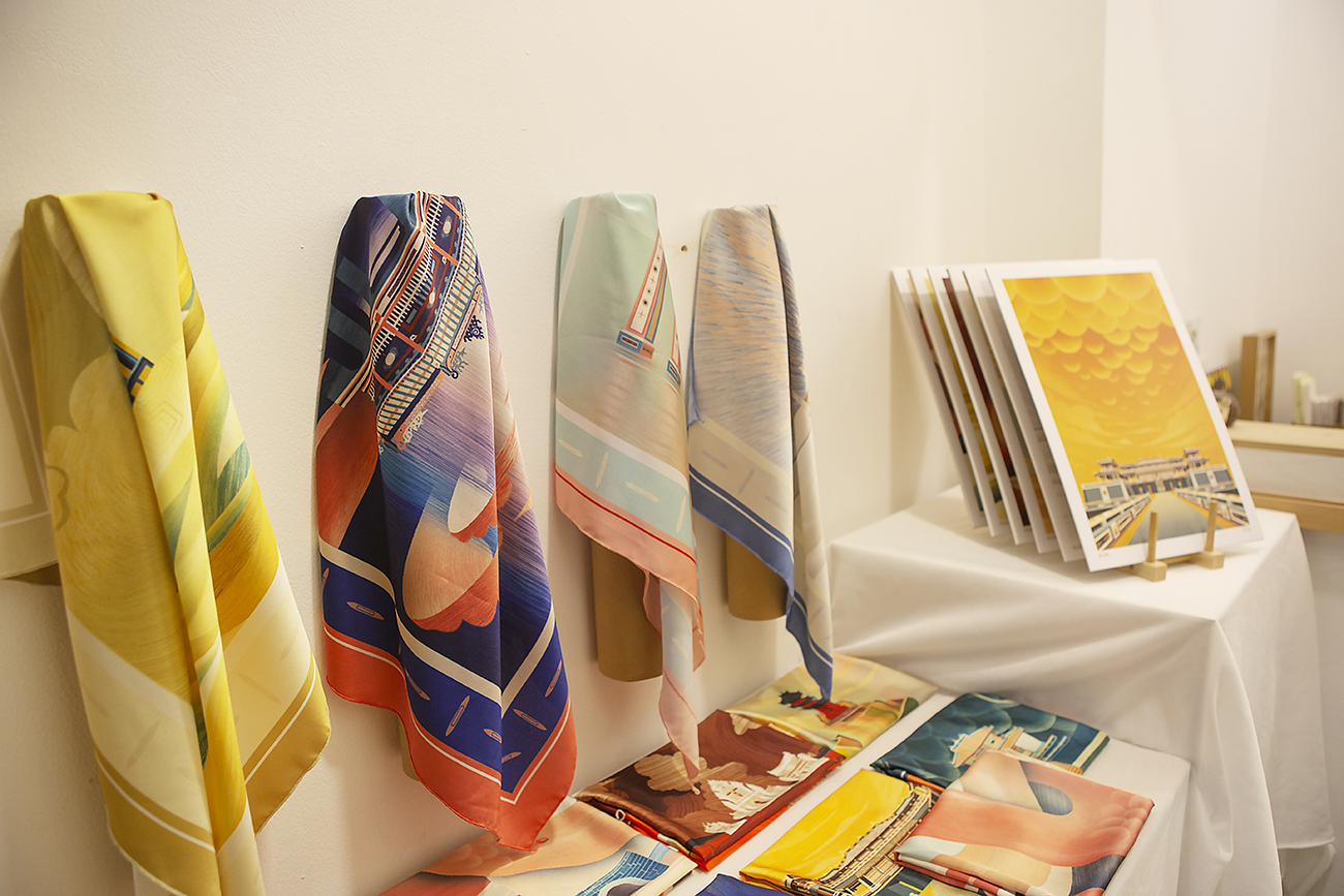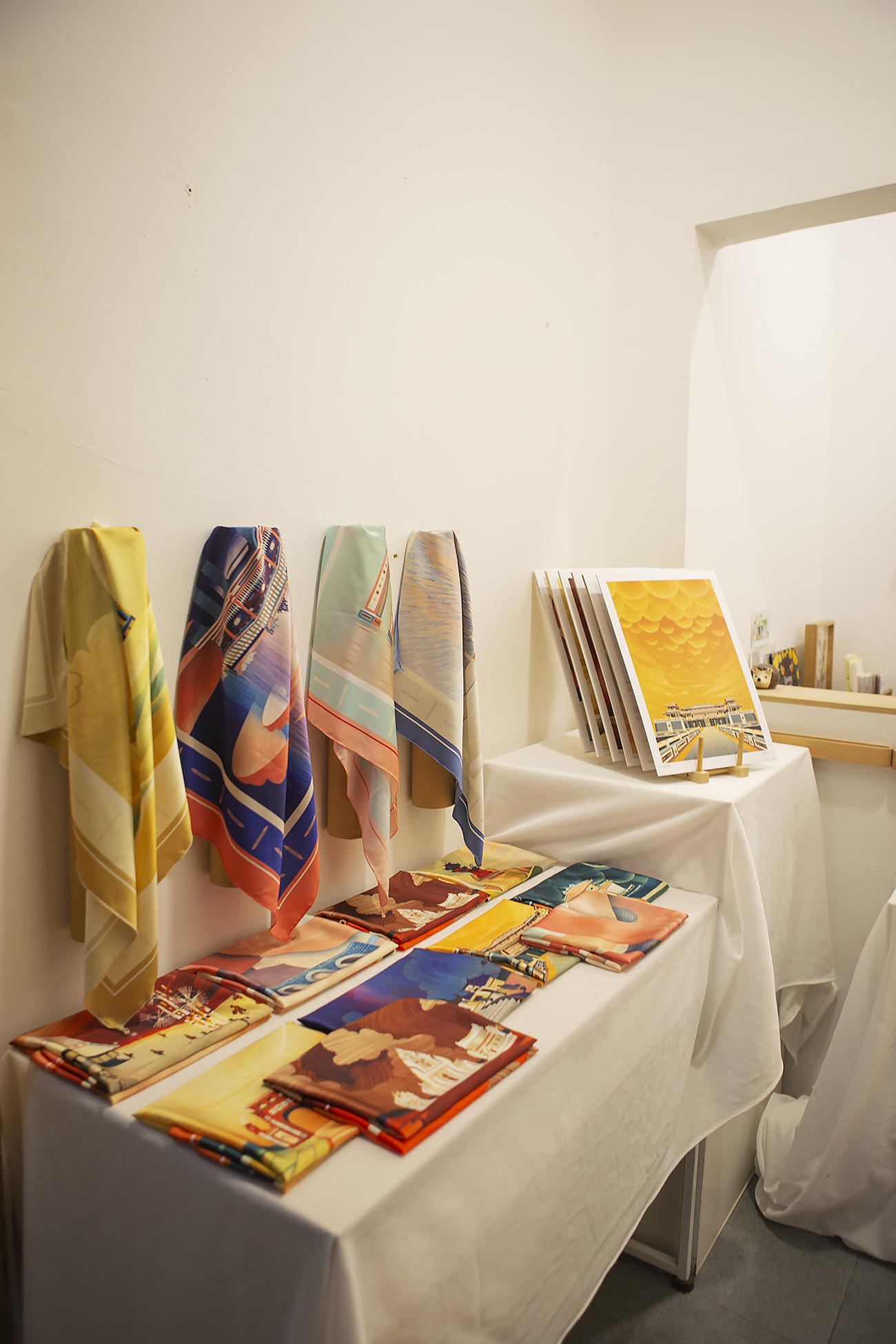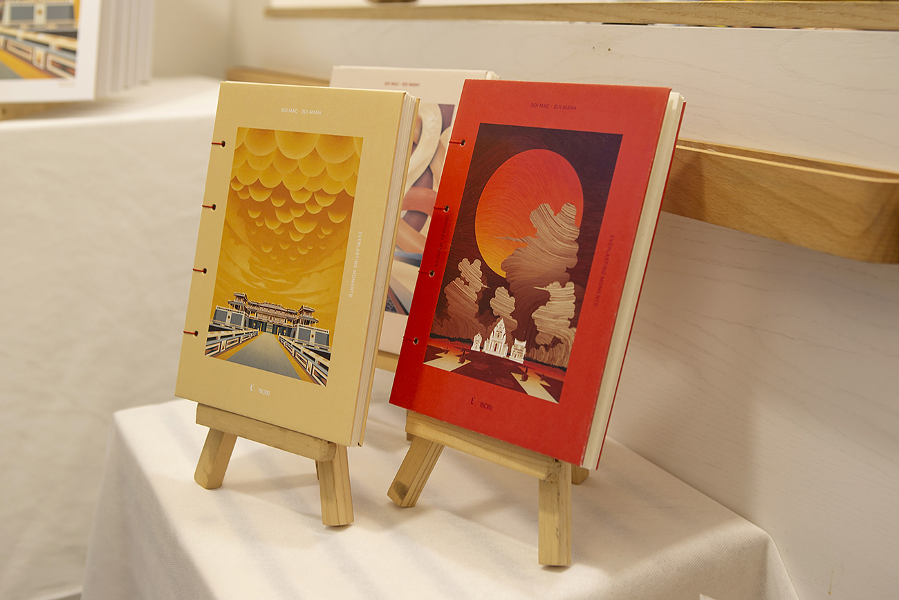 Đối lập với 12 bức giới thiệu thông tin của các công trình theo ảnh trắng đen, ở không gian trưng bày, Todd và team Monosketch cho người xem được “cách ly khỏi mặt đất” và bay trên mây với các tác phẩm được vẽ lại theo phong cách vị lai, siêu thực, đi kèm cùng các điển tích, câu chuyện đằng sau từng công trình.