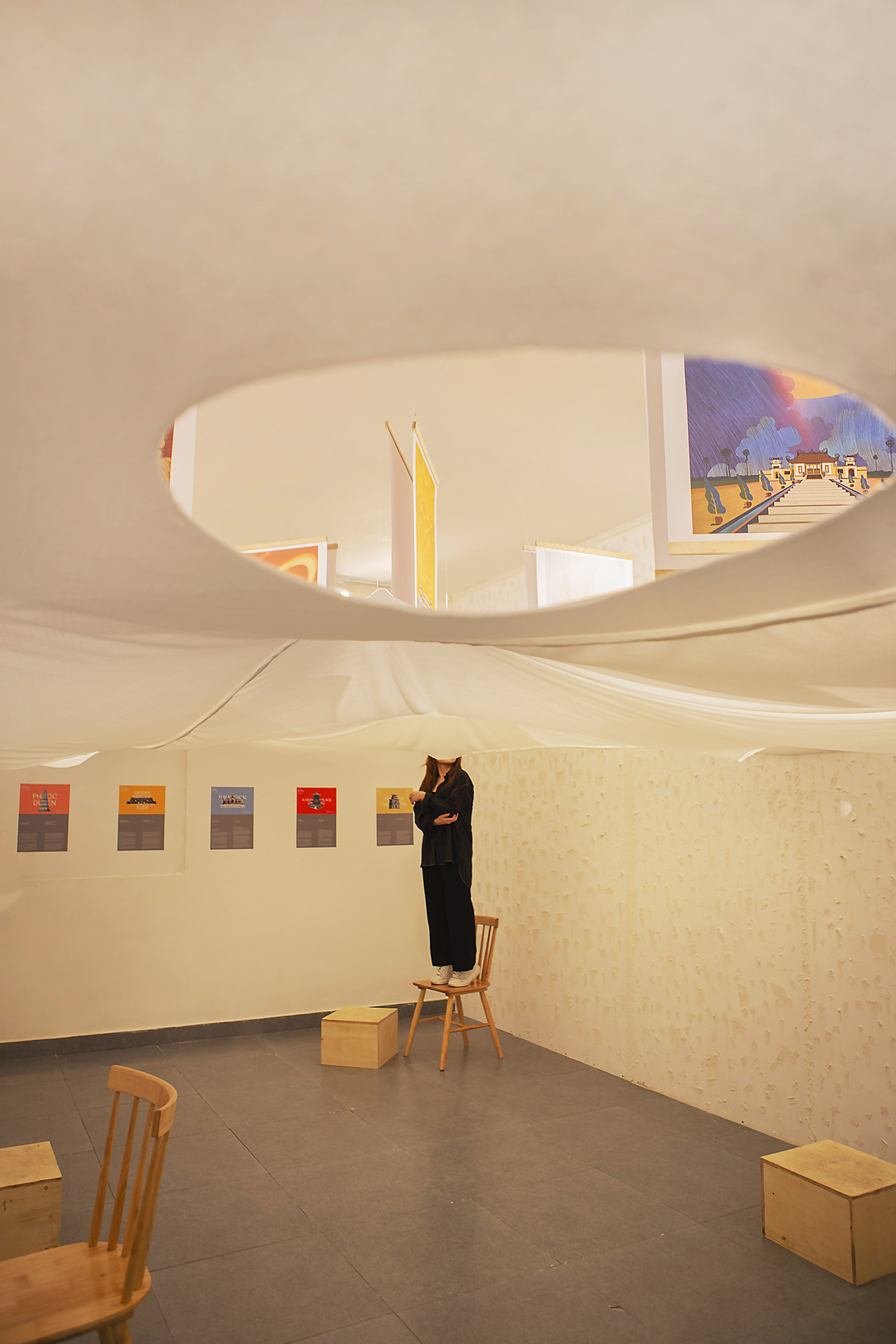 Nhưng do địa điểm bị hạn chế nên tụi mình chuyển qua kiểu “khoét lỗ”. Tức, vẫn ngăn được không gian cho người xem trải nghiệm, và thậm chí sẽ còn hay hơn nữa khi nó được trải nghiệm theo phương dọc, trùng theo phương của sợi mắc.