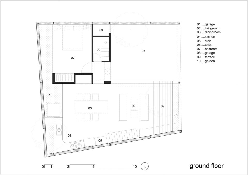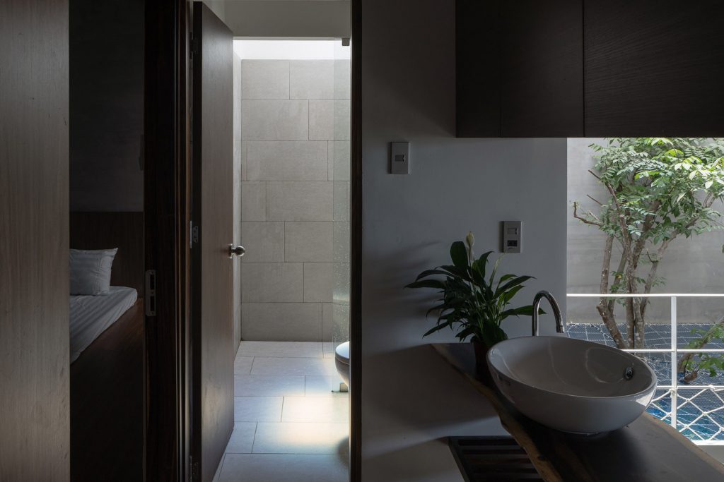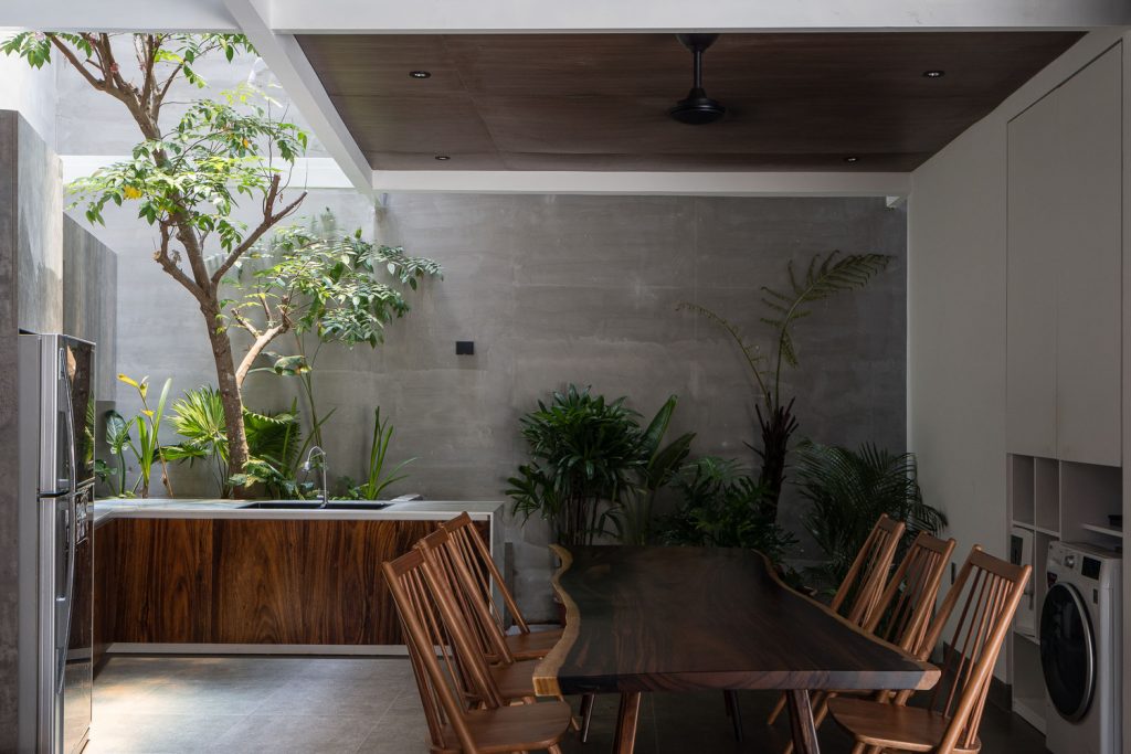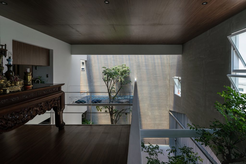 Cây cối bao quanh ngôi nhà và mỗi không gian đều mở ra một mảng xanh, lấy ánh sáng từ giếng trời. Vì vậy các không gian kết nối với nhau tạo nên sự gắn kết giữa 3 thế hệ trong gia đình: ông bà – bố mẹ – con cái. Do gia đình có nhiều thế hệ nên ngôi nhà phải cung cấp đầy đủ công năng từ khu thờ cúng trang nghiêm đến lưới chắn trẻ em phía trên bãi xe.