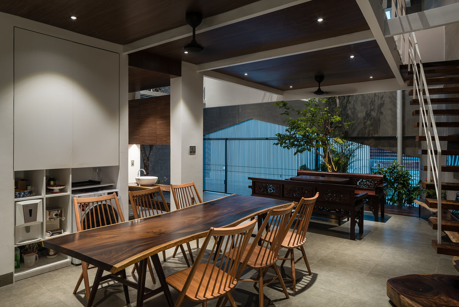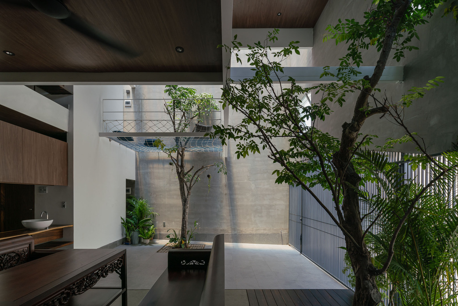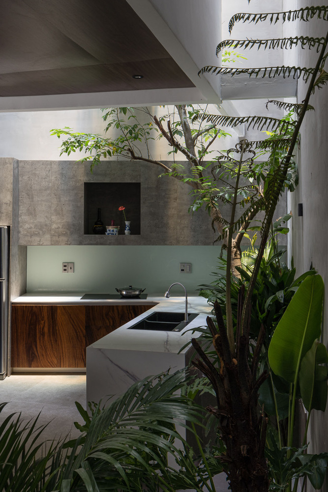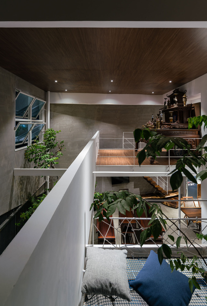 Cây cối bao quanh ngôi nhà và mỗi không gian đều mở ra một mảng xanh, lấy ánh sáng từ giếng trời. Vì vậy các không gian kết nối với nhau tạo nên sự gắn kết giữa 3 thế hệ trong gia đình: ông bà – bố mẹ – con cái. Do gia đình có nhiều thế hệ nên ngôi nhà phải cung cấp đầy đủ công năng từ khu thờ cúng trang nghiêm đến lưới chắn trẻ em phía trên bãi xe.
