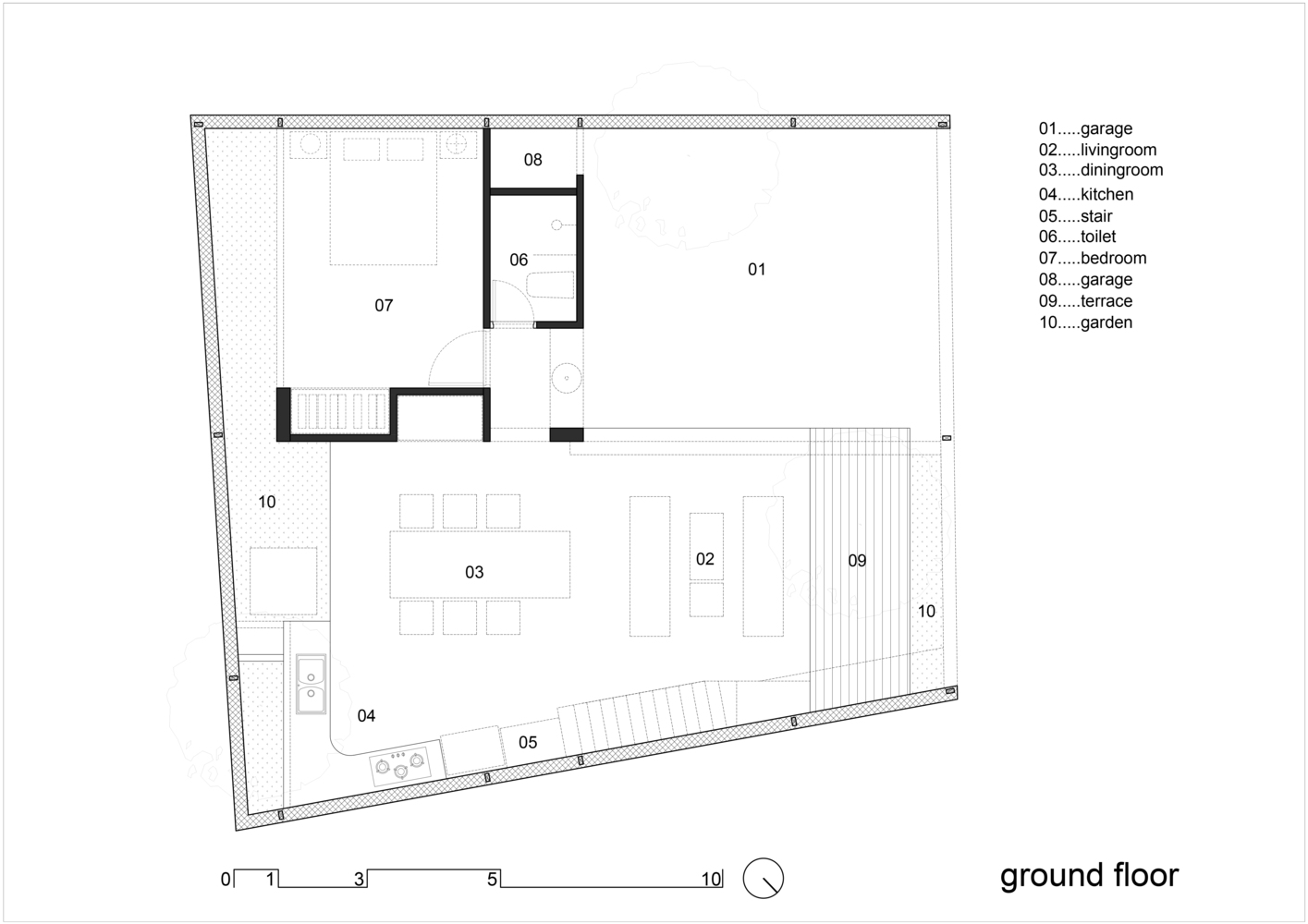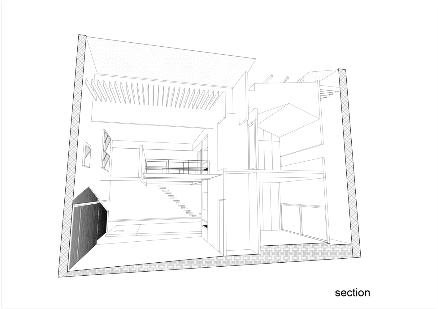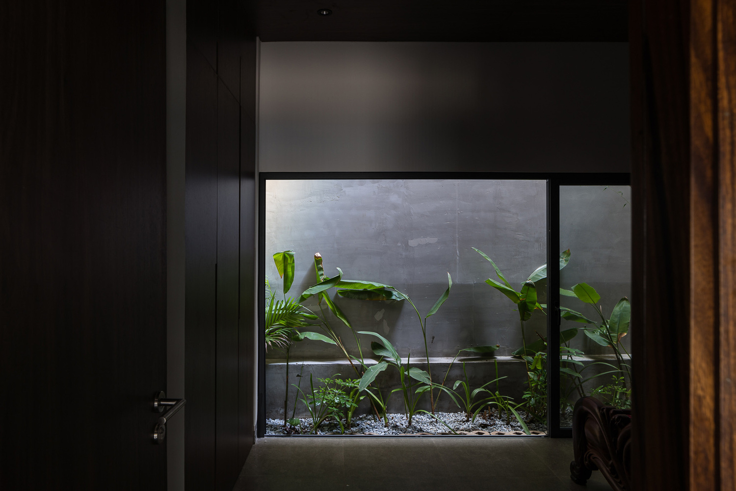 Cây cối bao quanh ngôi nhà và mỗi không gian đều mở ra một mảng xanh, lấy ánh sáng từ giếng trời. Vì vậy các không gian kết nối với nhau tạo nên sự gắn kết giữa 3 thế hệ trong gia đình: ông bà – bố mẹ – con cái. Do gia đình có nhiều thế hệ nên ngôi nhà phải cung cấp đầy đủ công năng từ khu thờ cúng trang nghiêm đến lưới chắn trẻ em phía trên bãi xe.