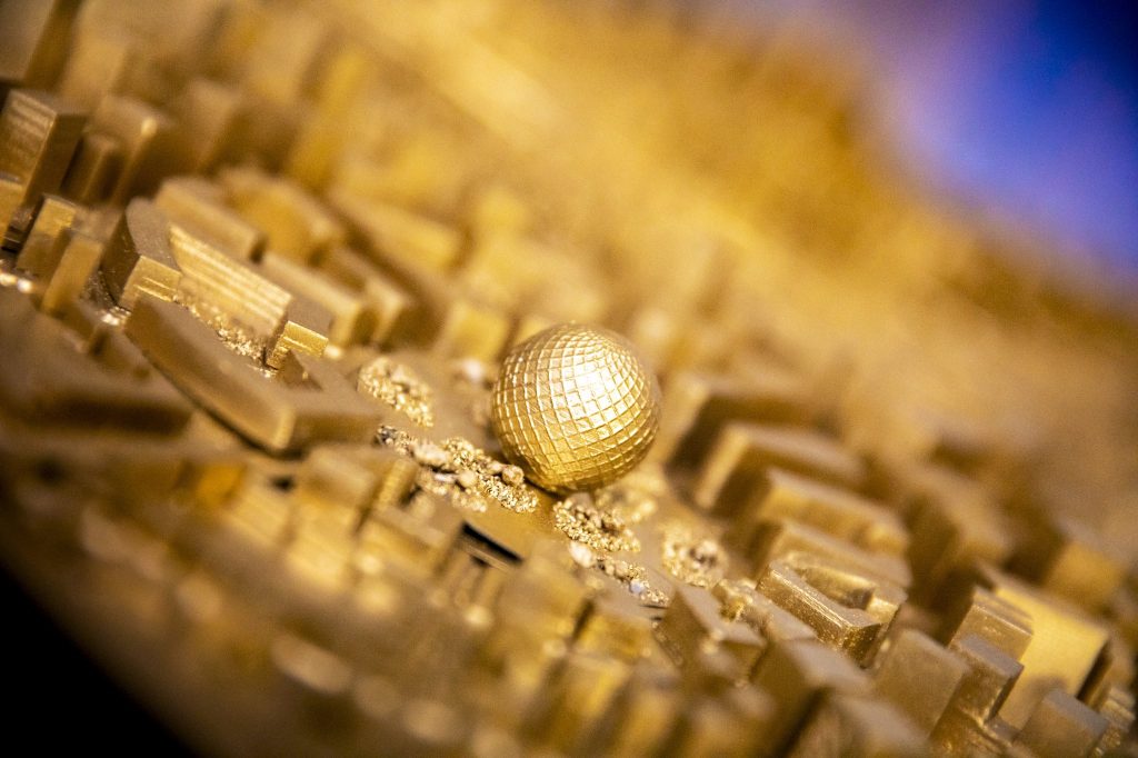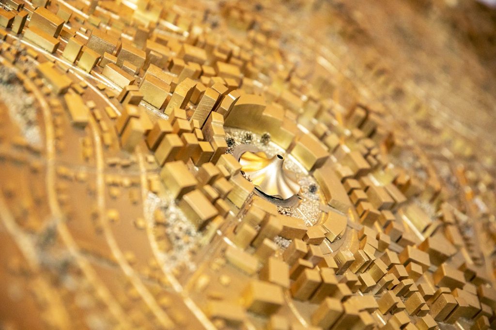 Mô hình Bitcoin City cho thấy một thành phố hình tròn màu vàng óng xoay quanh quảng trường trung tâm có hình dạng đồng bitcoin khổng lồ, cùng với nhiều tòa nhà mang tính biểu tượng khác.