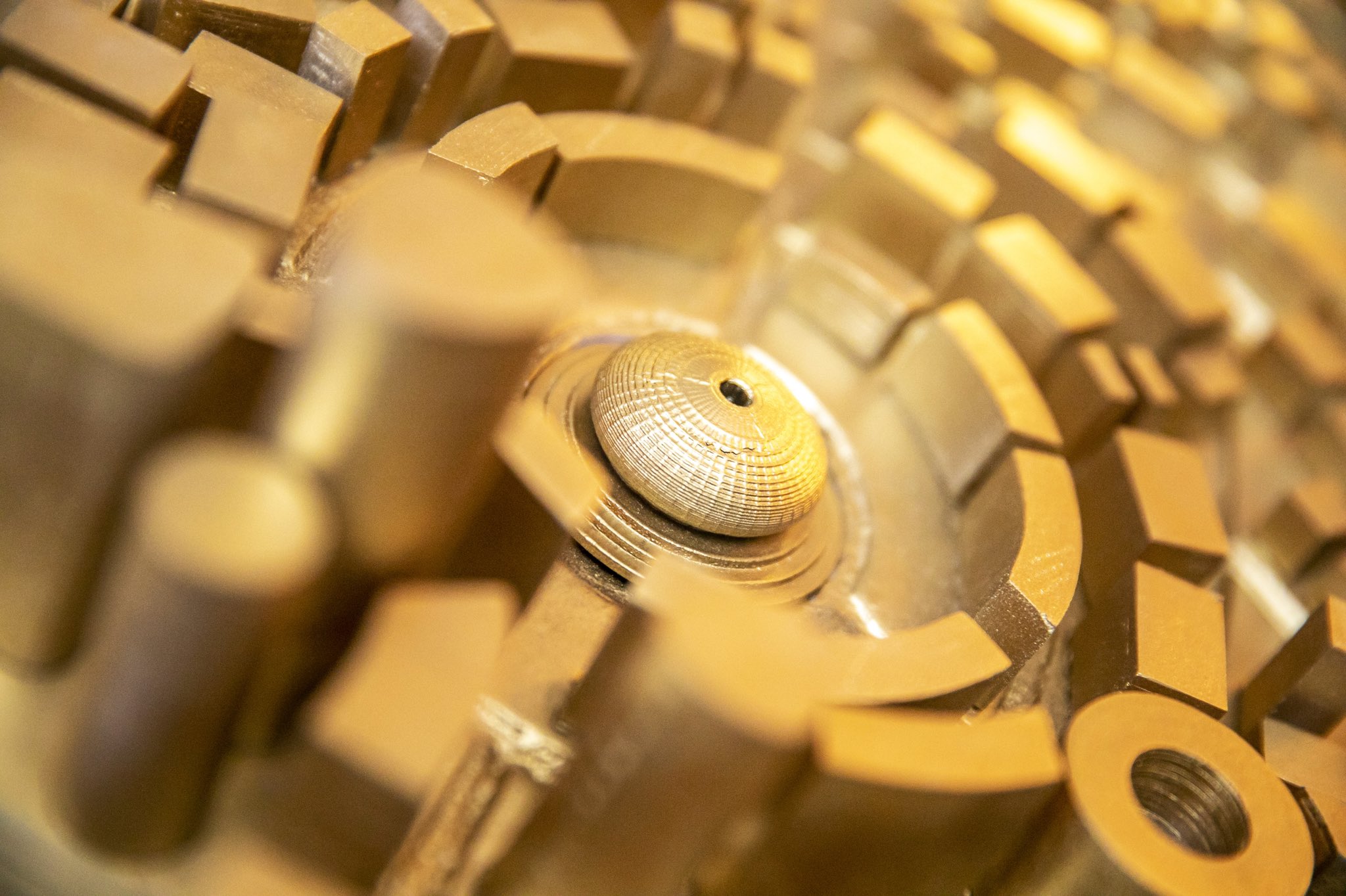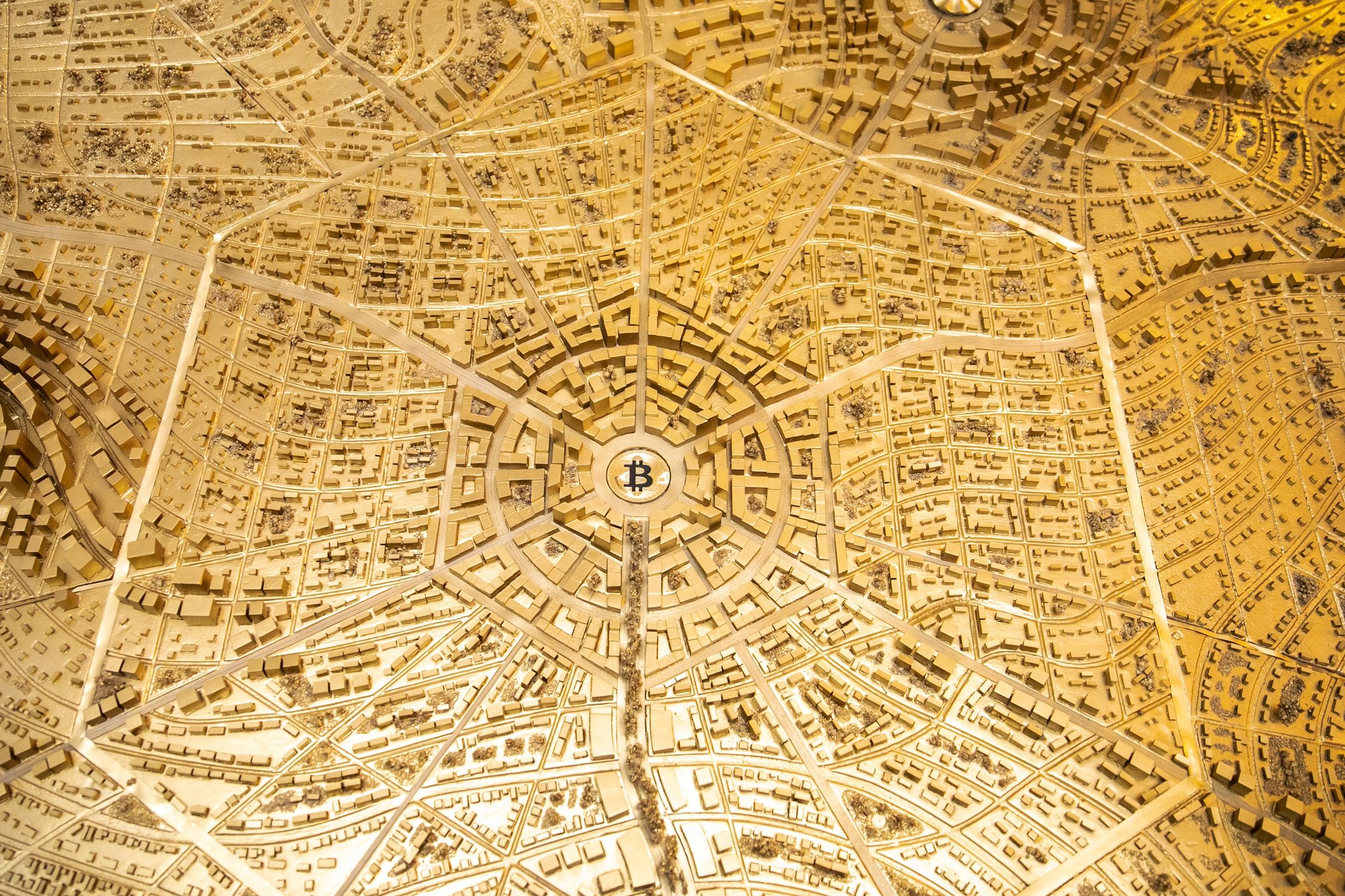 Mô hình Bitcoin City cho thấy một thành phố hình tròn màu vàng óng xoay quanh quảng trường trung tâm có hình dạng đồng bitcoin khổng lồ, cùng với nhiều tòa nhà mang tính biểu tượng khác.