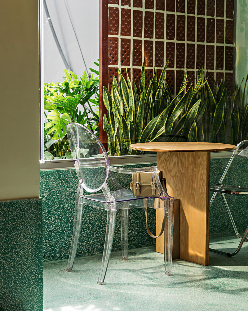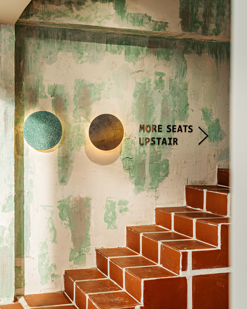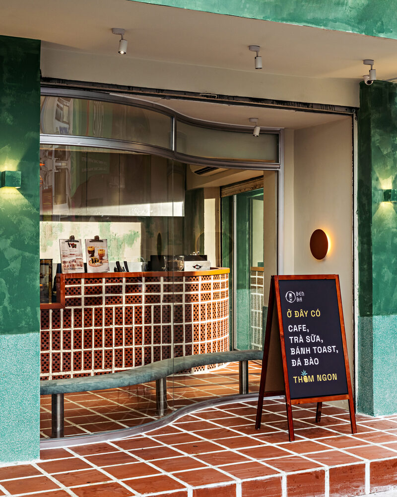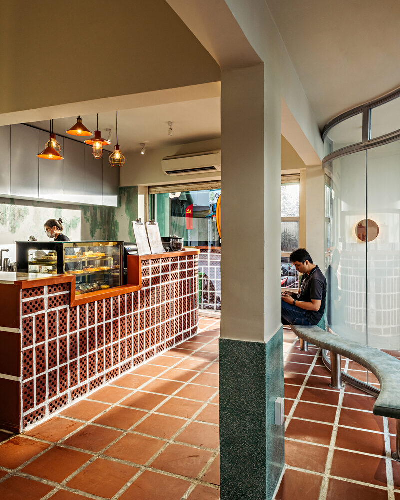 Không gian của quán mang lại cảm giác thoải mái nhờ cách bày trí tích hợp những món đồ cổ điển mang nhiều hoài niệm với những món đồ mang tính đột phá và hiện đại. Một ví dụ đó là những bức tường phủ màu xanh lá cây gợi nhớ lại ngôi nhà cũ, đi kèm với hộp đèn led hình tròn bằng inox – sơn màu cam thể hiện sự giao thoa của phong cách cũ và mới.