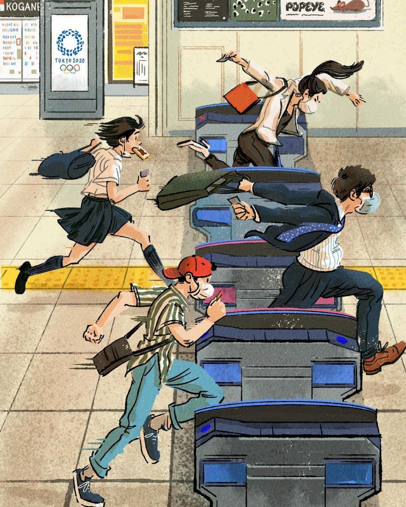 Để hưởng ứng sự kiện Thế vận hội, họa sĩ Adrian Hogan đã biến trí tưởng tượng phong phú của mình thành một loạt các bức tranh minh họa ấn tượng về Olympic, dựa trên cuộc sống hàng ngày của người dân thành thị trong thời Covid. Trong bộ tranh, nghệ sĩ biến tất cả các công dân của Tokyo thành các vận động viên Olympic.