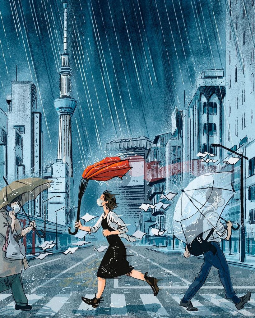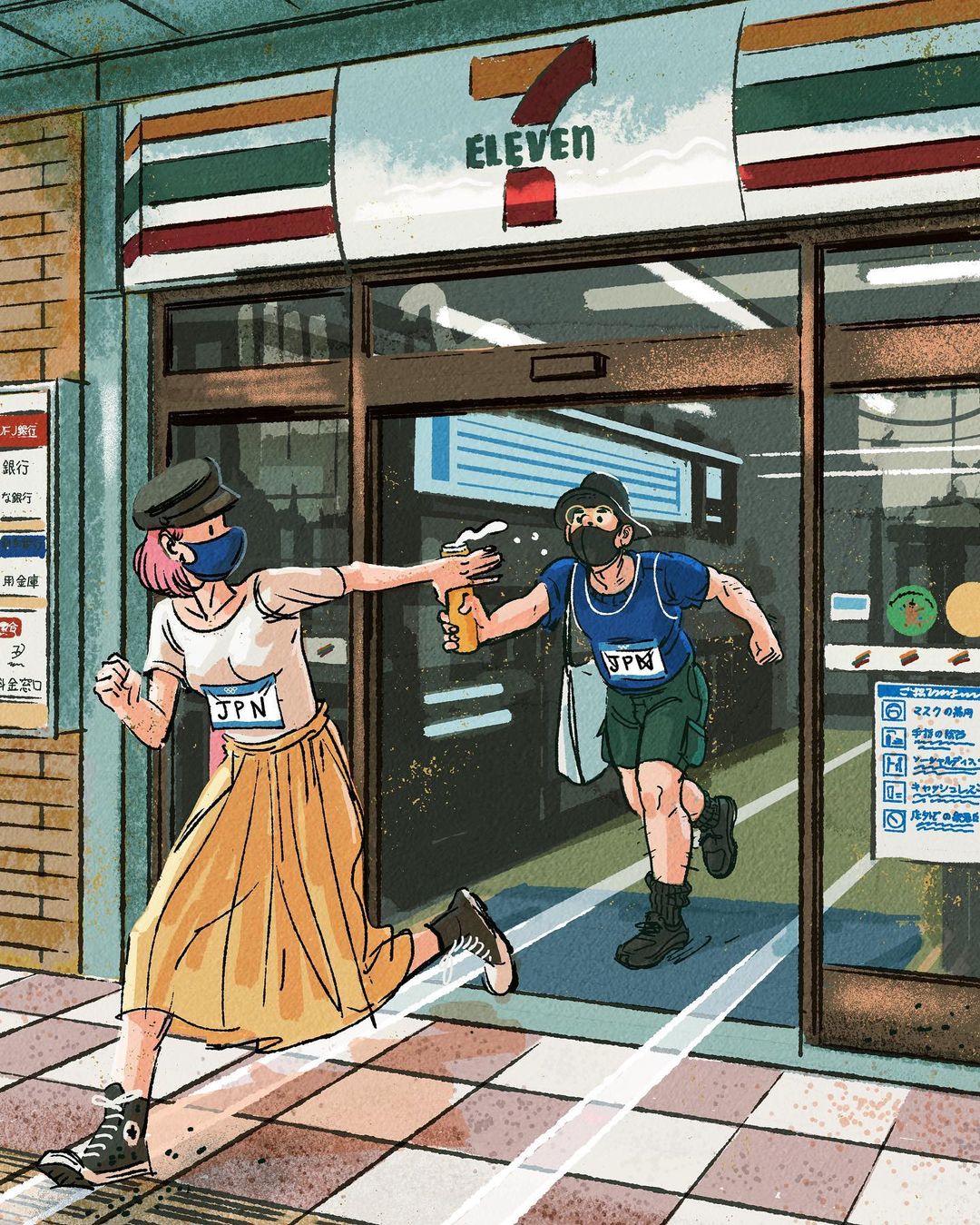Để hưởng ứng sự kiện Thế vận hội, họa sĩ Adrian Hogan đã biến trí tưởng tượng phong phú của mình thành một loạt các bức tranh minh họa ấn tượng về Olympic, dựa trên cuộc sống hàng ngày của người dân thành thị trong thời Covid. Trong bộ tranh, nghệ sĩ biến tất cả các công dân của Tokyo thành các vận động viên Olympic.