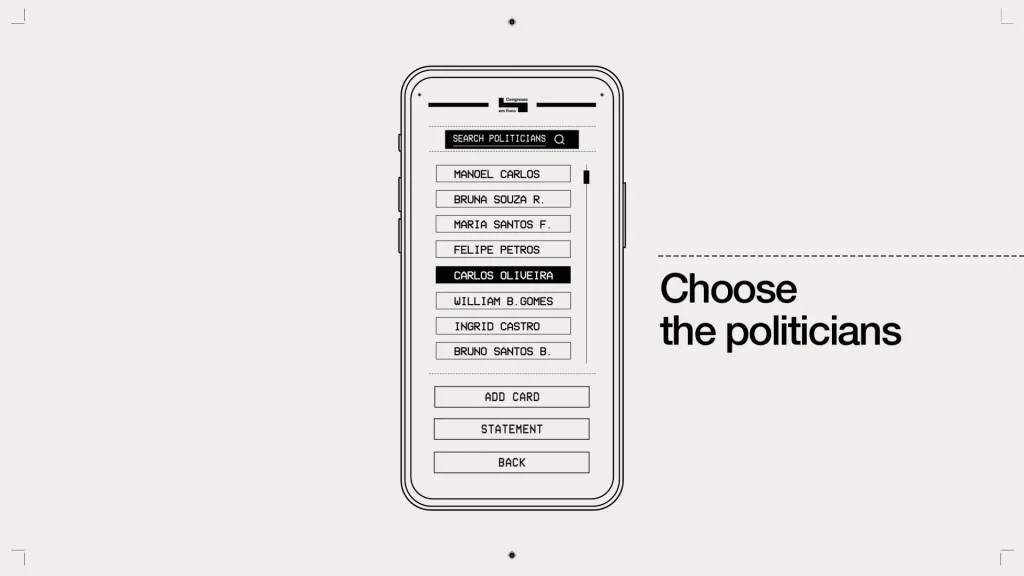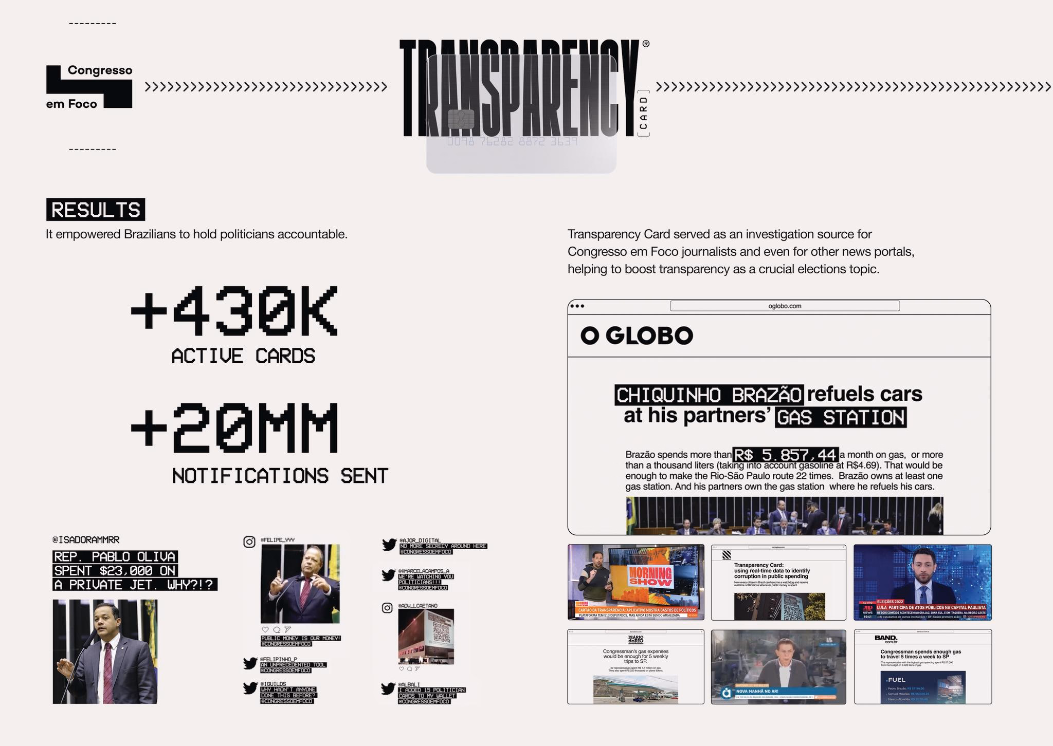 Để giải quyết vấn đề này, công ty sáng tạo kỹ thuật số toàn cầu AKQA (thuộc agency WWP) đã phối hợp với cổng tin tức Congresso em Foco ra mắt Transparency Card – một công cụ tích hợp vào ví điện tử, mô phỏng thông báo thẻ tín dụng nhằm minh bạch chi tiêu chính trị theo thời gian thực.