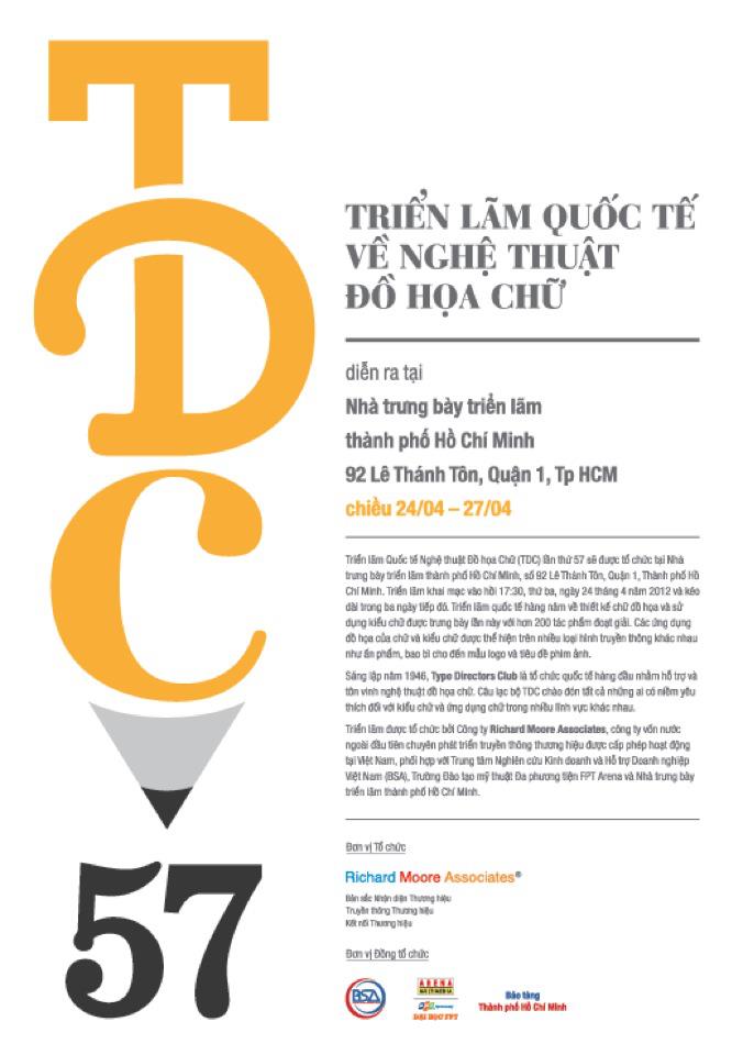 Kể từ năm 1994, Triển lãm Quốc tế Nghệ thuật Đồ họa chữ TDC thường niên chưa có dịp đến với thành phố Hồ Chí Minh. Để đáp lại niềm mong đợi của những người làm marketing, các nhà thiết kế, sáng tạo, những người biên tập, chuyên gia truyền thông, học sinh, sinh viên và bất cứ ai đam mê nghệ thuật chữ đồ họa, hơn 200 tác phẩm đoạt giải của cuộc thi quốc tế TDC 57 sẽ được trưng bày tại Nhà trưng bày triển lãm thành phố Hồ Chí Minh, số 92 Lê Thánh Tôn, Quận 1, Thành phố Hồ Chí Minh.