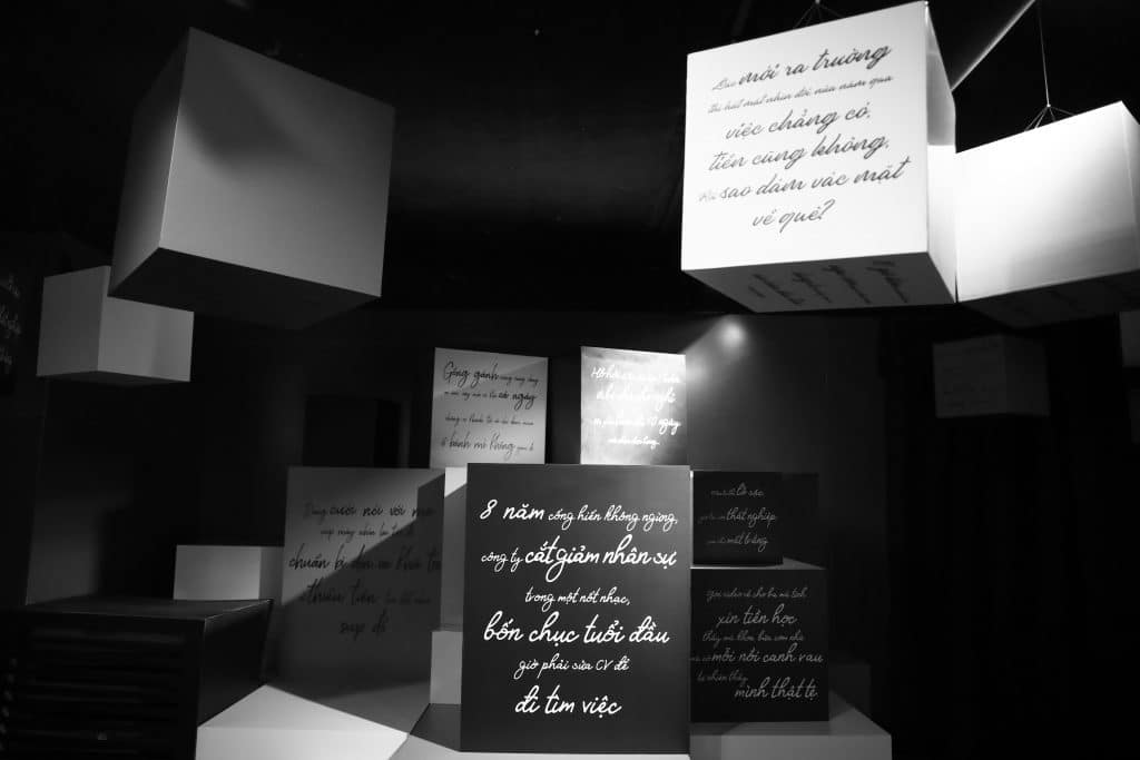 Phòng “Vỗ”: vừa bước vào không gian đầu tiên, người xem liền bất ngờ và đồng cảm khi cả căn phòng hiện ra những áp lực, khó khăn mà mình phải đối mặt suốt một năm qua. Trong căn phòng trắng, những câu chuyện đời thường, những nỗi niềm chất chứa được viết lên thành lời, khắc trên những khối đen trắng nặng trĩu.