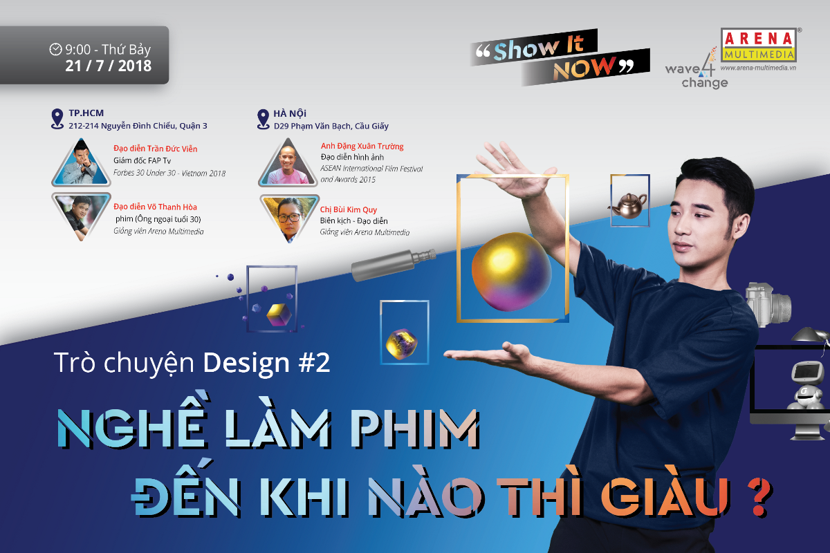 Sau chủ đề đầu tiên về “Nghề Thiết kế – Những ngã rẽ”, tập trung vào cơ hội nghề nghiệp, triển vọng phát triển nghề trong lĩnh vực Thiết kế sáng tạo, Branding và UX/UI Design với những chia sẽ vô cùng thú vị, dí dỏm và hữu ích của chị Minh Thy (Richard Moore Associates), anh Tùng Juno (RIO Creative) và anh Hoàng Nguyễn (InteractiveLabs), lần này Ban tổ chức của Show It NOW sẽ giới thiệu với các bạn trẻ quan tâm đến Nghề Làm Phim các diễn giả hàng đầu của ngành công nghiệp điện ảnh, giải trí như Đạo diễn Võ Thanh Hoà (phim Ông ngoại tuổi 30), Đạo diễn Trần Đức Viễn (Giám đốc FAPtv), DOP Đặng Xuân Trường, (ASEAN International Film Festival & Awards 2015) và Đạo diễn Bùi Kim Quy. Buổi hội thảo sẽ diễn ra đồng thời tại TP HCM và Hà Nội.