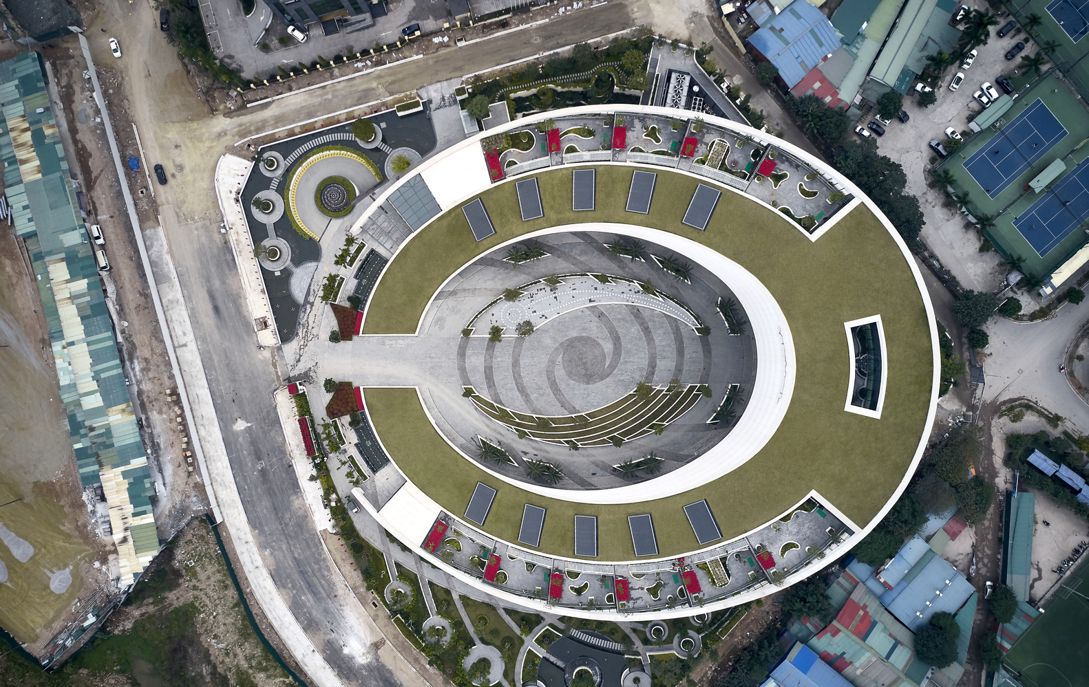 Thiết kế cảnh quan đẹp mắt về mặt thẩm mỹ kết hợp với các loài thực vật bản địa tạo thành mái nhà xanh mang tính biểu tượng, bên cạnh đó còn có tác dụng làm giảm sức nóng trong suốt cả ngày. Người dùng cũng có thể tận hưởng không gian phá cách tại những khu vườn trên mái bậc thang cảnh quan hai bên mái dốc. Các tính năng xanh khác còn có hệ thống thu gom nước mưa.