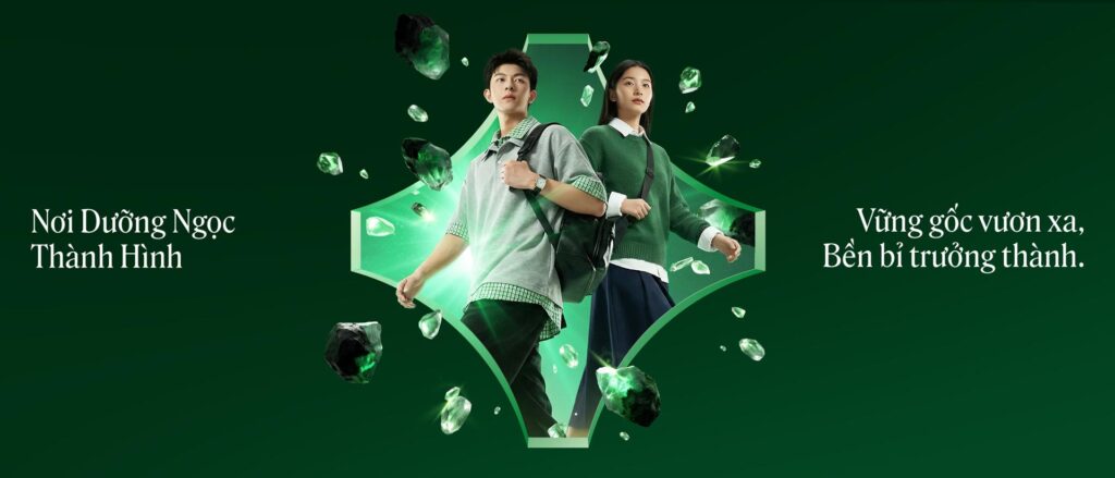 Sắc ngọc bích ở đây không chỉ mang tính biểu tượng mà còn đóng vai trò như một “trục” thị giác, kết nối các yếu tố trong hệ nhận diện và tạo nên một ngôn ngữ xuyên suốt.