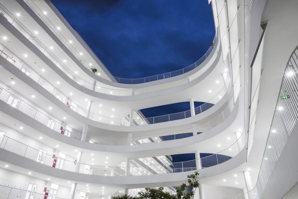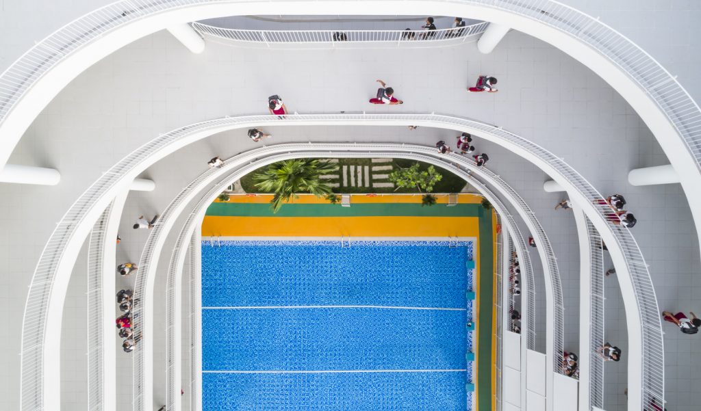 Với đường nét uyển chuyển làm mềm mại phông nền kiến trúc cho các hoạt động, các vùng hiên rộng lớn này đã biểu hiện dòng trôi chảy liên tục của năng lượng học tập được kết nối giữa các cấp học trong quần thể ngôi trường liên cấp.