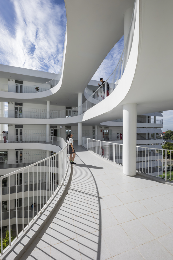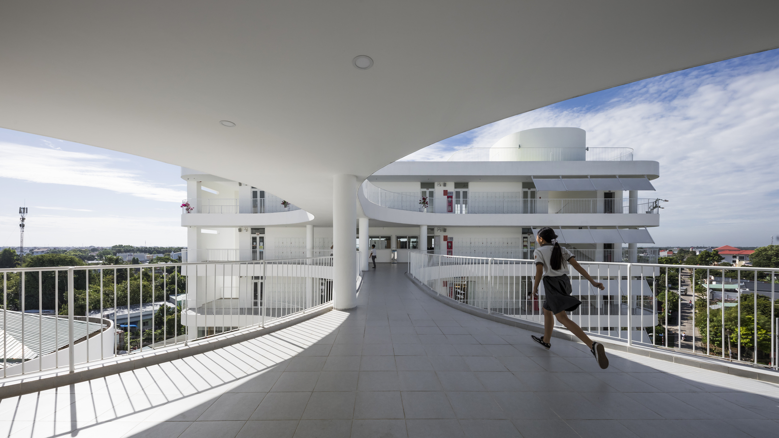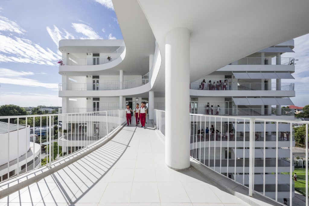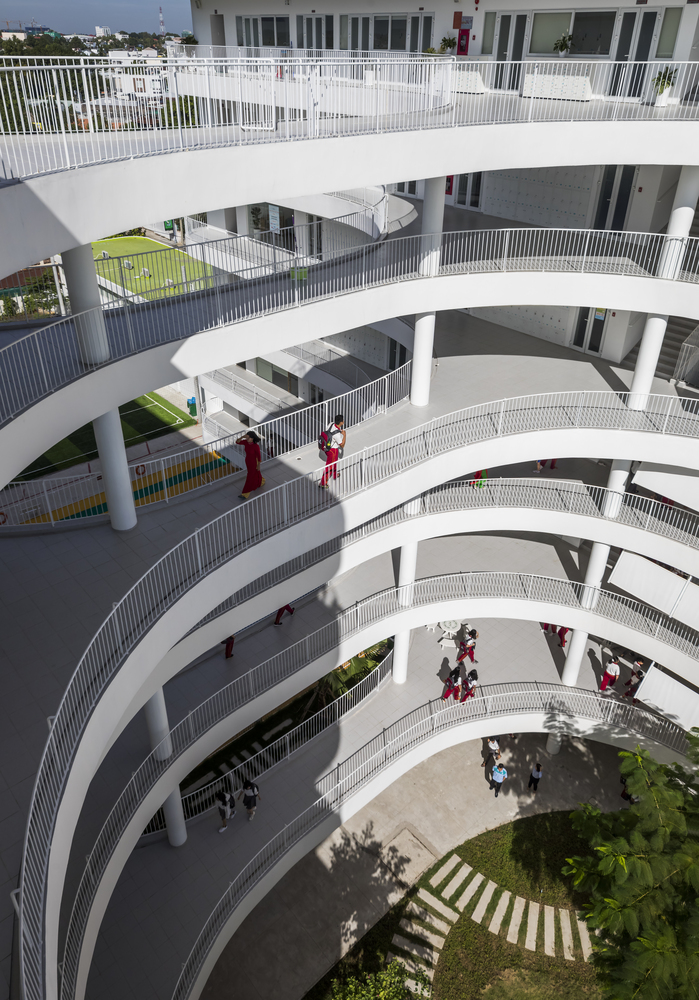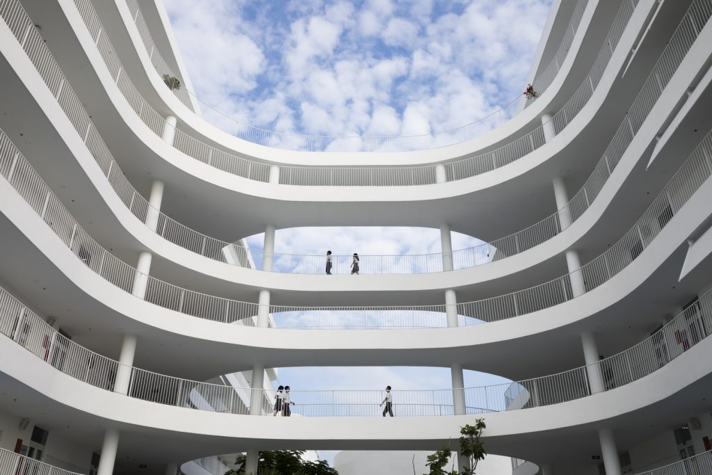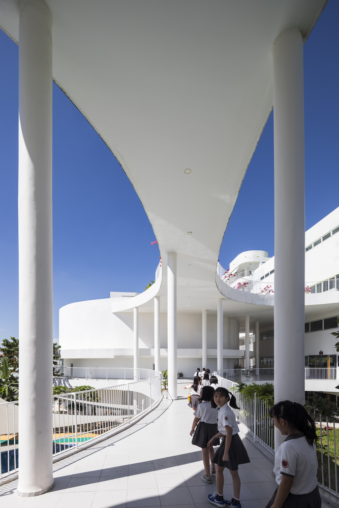 Với đường nét uyển chuyển làm mềm mại phông nền kiến trúc cho các hoạt động, các vùng hiên rộng lớn này đã biểu hiện dòng trôi chảy liên tục của năng lượng học tập được kết nối giữa các cấp học trong quần thể ngôi trường liên cấp.