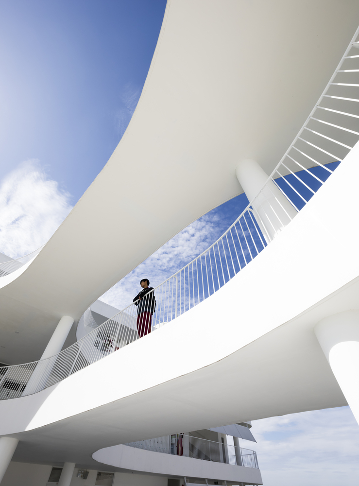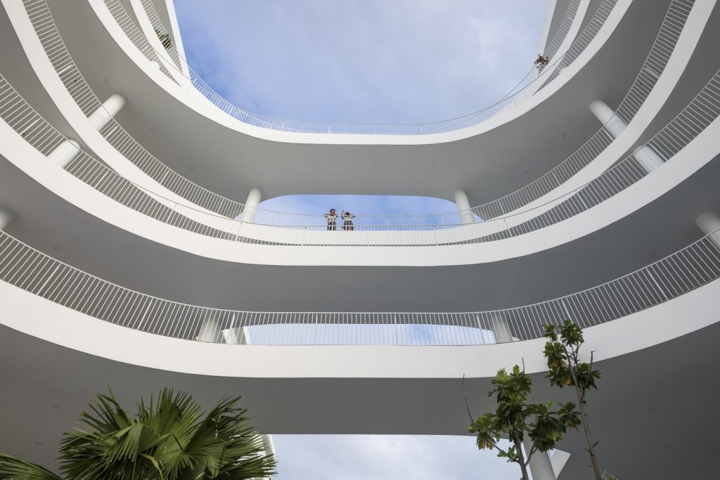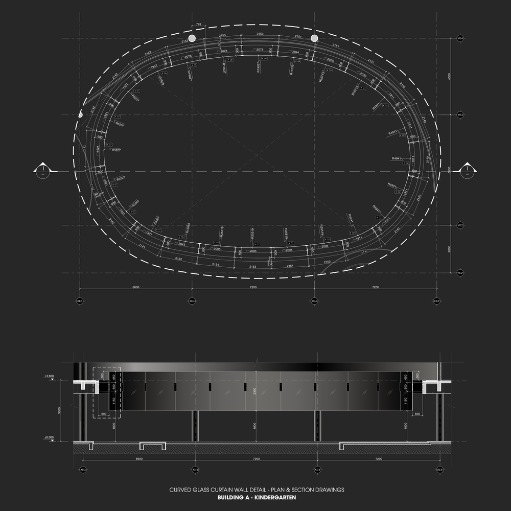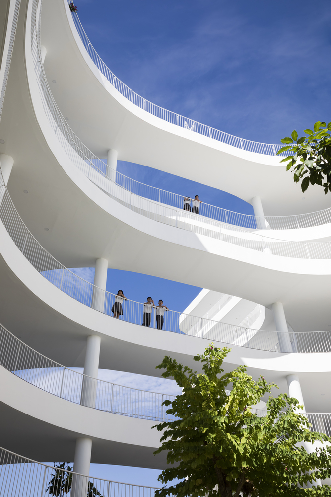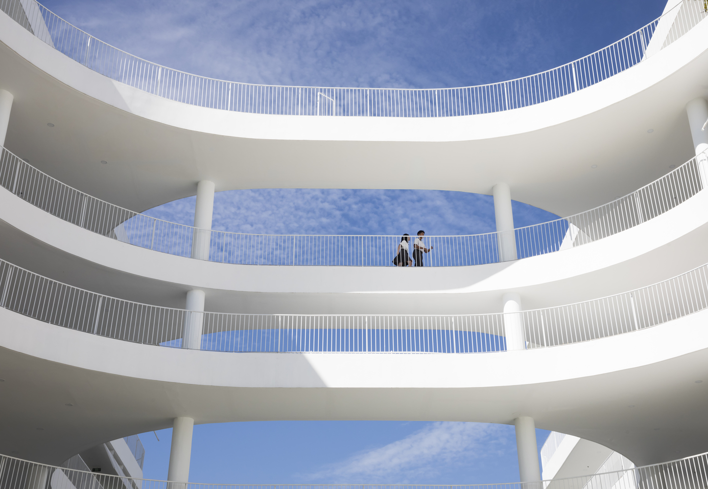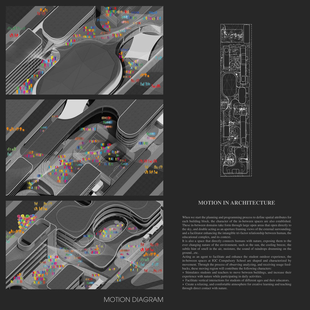 Với đường nét uyển chuyển làm mềm mại phông nền kiến trúc cho các hoạt động, các vùng hiên rộng lớn này đã biểu hiện dòng trôi chảy liên tục của năng lượng học tập được kết nối giữa các cấp học trong quần thể ngôi trường liên cấp.
