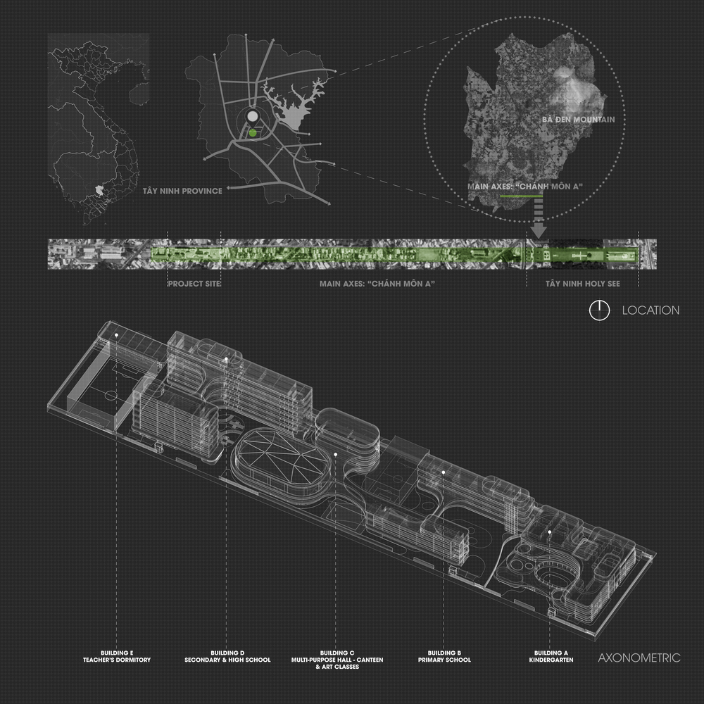 Sự trải dài suốt 2 trục đường này tạo nên sự thuận lợi cho kiến trúc ngôi trường trong việc tổ chức quần thể kiến trúc giáo dục sinh động bao gồm nhiều cụm công trình cho các cấp học khác nhau dựa theo các tâm lý lứa tuổi từ hệ thống mầm non cho đến bậc phổ thông trung học.
