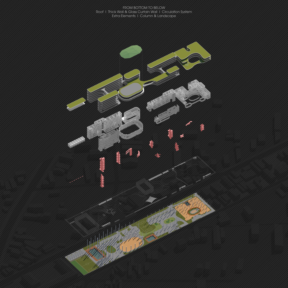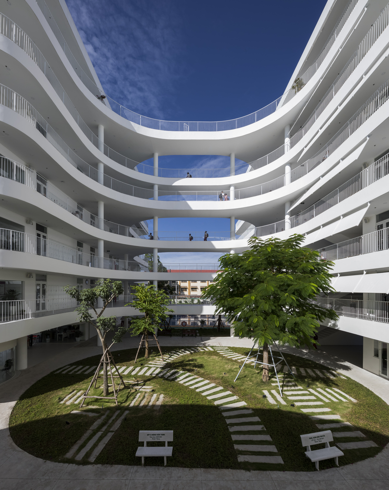Kết nối giữa 2 khoảng sân rộng và dài này là các khu vực chức năng phục vụ việc học tập cùng với nhà ăn lớn; hội trường đa chức năng kiêm nhiệm các hoạt động thể thao và biểu diễn trong nhà; các phòng hoạt động nghệ thuật, sáng tạo và triển lãm… được tổ chức nhằm tối ưu hóa việc di chuyển và vận hành để các hoạt động liên quan đến học tập được diễn ra liên tục.