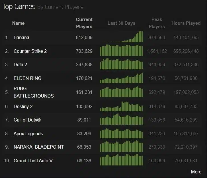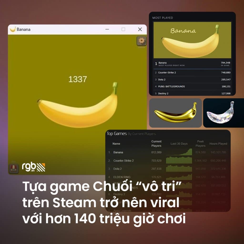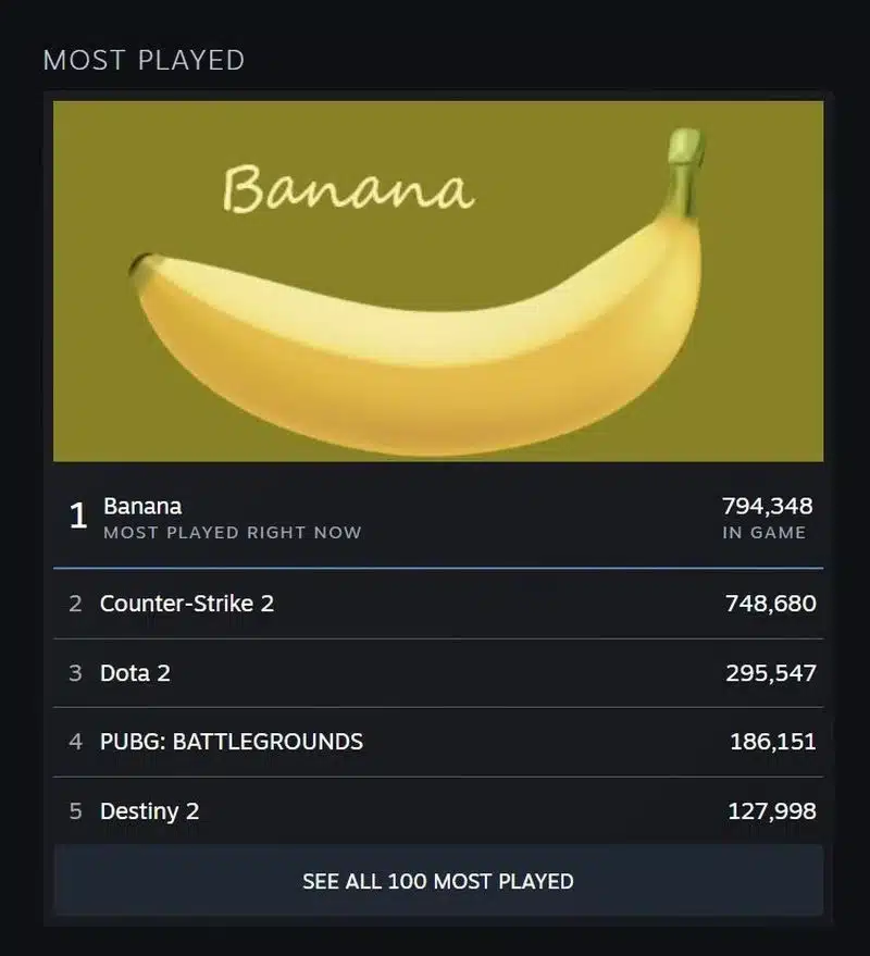 Đó thực sự là một con số rất lớn đối với bất kỳ trò chơi nào trên Steam. Số lượng người chơi đồng thời cho Banana đang tiếp tục tăng lên và vẫn chưa có dấu hiệu dừng lại.