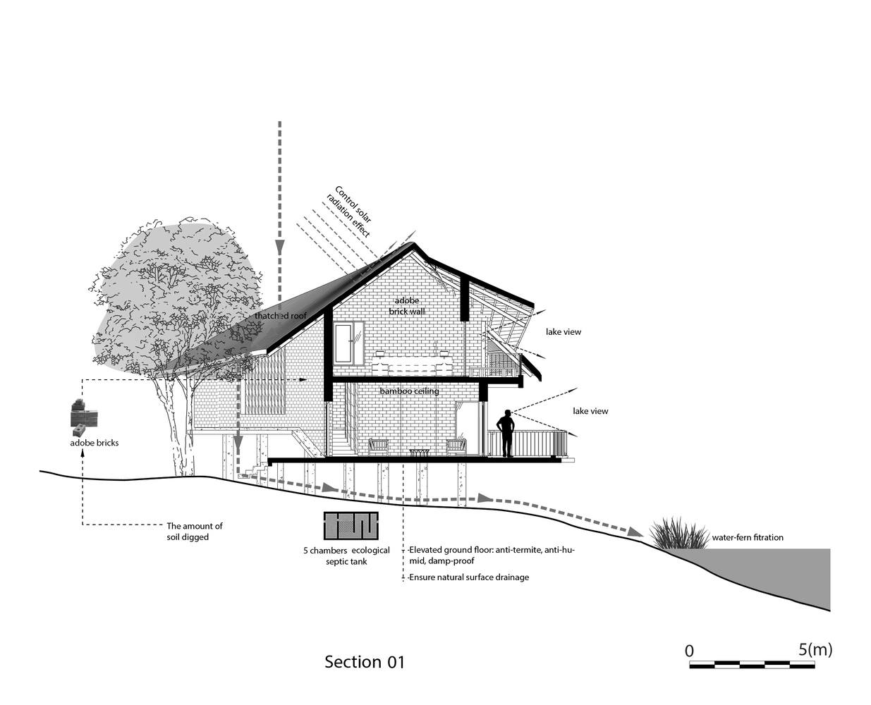 Một điểm đặc biệt của ngôi nhà đó là sử dụng gạch không nung (gạch adobe) được lấy từ chính đất tại nơi đây. Ngôi nhà tạo ra một bầu không khí ấm cúng và thân thiện, liên quan đến bối cảnh xung quanh. Thiết kế này là một gợi ý cho kiến trúc nhà ở nông thôn đương đại.