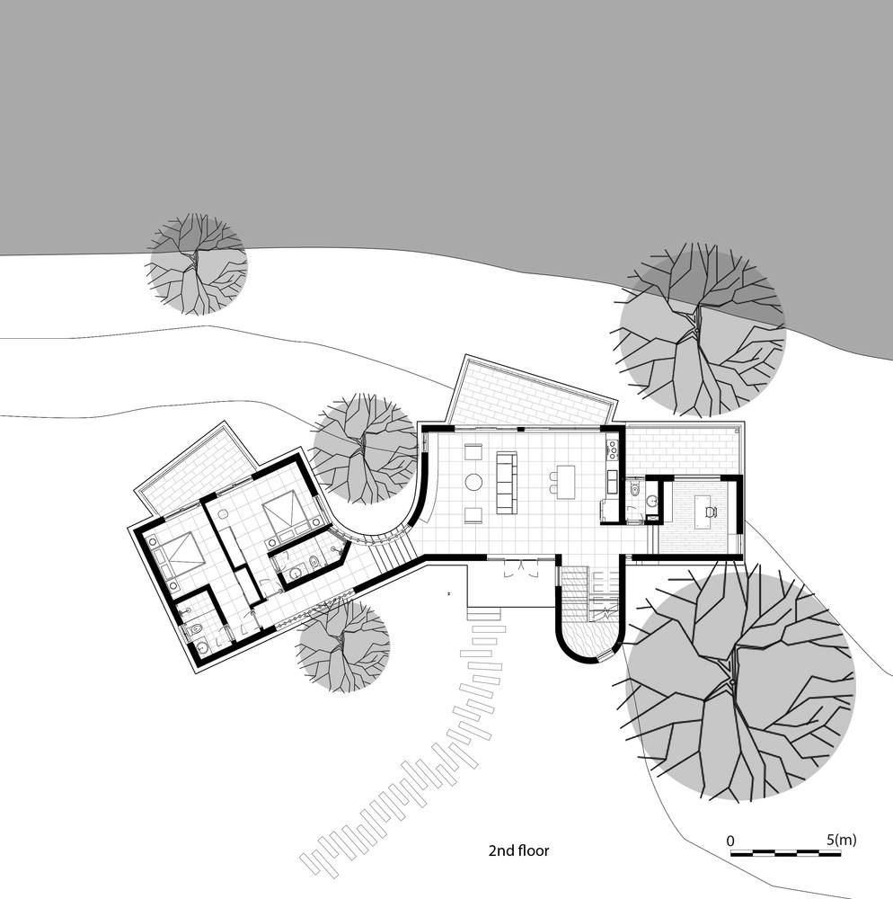 Cấu trúc của căn nhà được phát triển theo chiều ngang để tối đa hóa tầm nhìn ra hồ. Không gian chung và nhà bếp nằm ở trung tâm, bên cạnh là phòng làm việc, phòng khách và phòng cho người giúp việc. Phòng ngủ chính và phòng xông hơi nằm trên tầng hai với ban công có hình dáng đặc biệt tạo nên một khung cảnh ấn tượng.