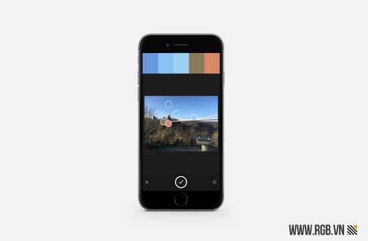 Bạn dễ dàng dừng camera lại, chọn bảng màu đang hiển thị bằng cách chọn dấu tick bên dưới màn hình, tạo theme màu và lưu trực tiếp trên Creative Cloud. Một khi bạn xong, bấm dấu + để tiếp tục tạo theme màu. Thêm nữa, bạn có thể chọn theme màu từ hình trong camera roll.