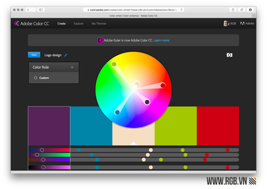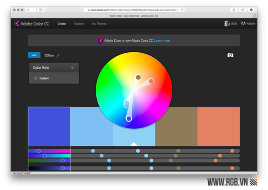 Tuy nhiên, điều tuyệt vời ở Color CC là cách nó làm thay đổi quá trình làm việc của bạn. Sau khi bạn tạo theme xong, sign in vào trang color.adobe.com, bạn sẽ edit thêm những theme này và download file . ASE và import vào Photoshop, Illustrator và Indesign để làm swatch. Bạn cũng có thể tìm thêm theme màu người khác tạo để làm nguồn cảm hứng.