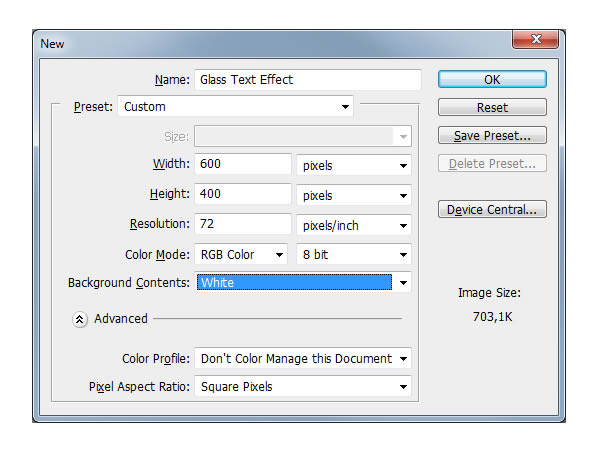Đầu tiên chúng ta tạo một file mới trong photoshop kích thước 600 x 400 pixels với mode là RGB, 72 PDI với background là màu TRẮNG.