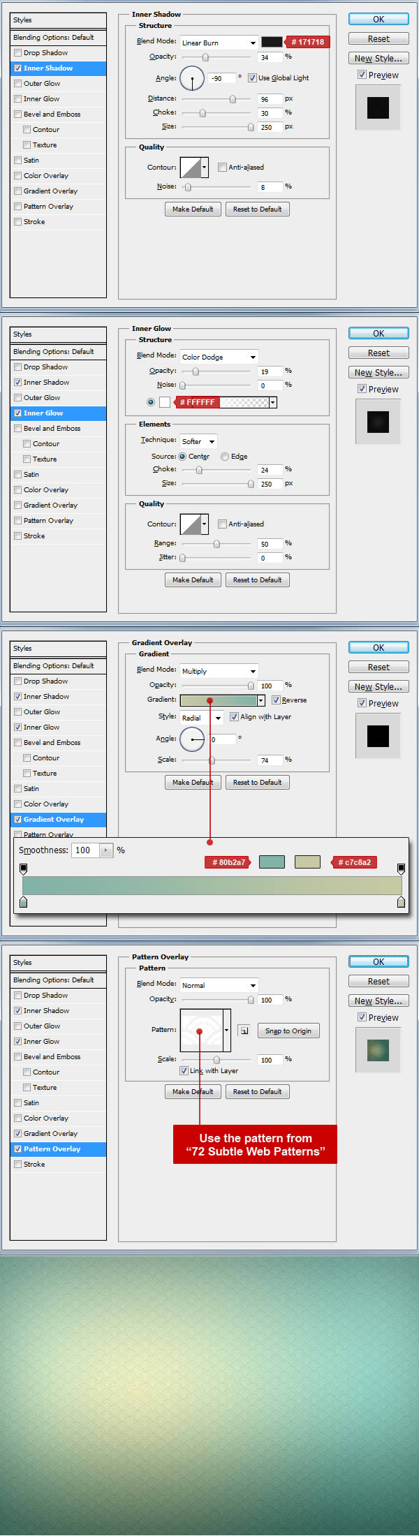 Chúng ta sẻ tạo background bằng cách chọn menu Layer > Layer Style > Blending Options và thiết lập theo hình. Trong bài sử dụng pattern số 31 hoặc các bạn có thể sử dụng các pattern khác tùy thích.