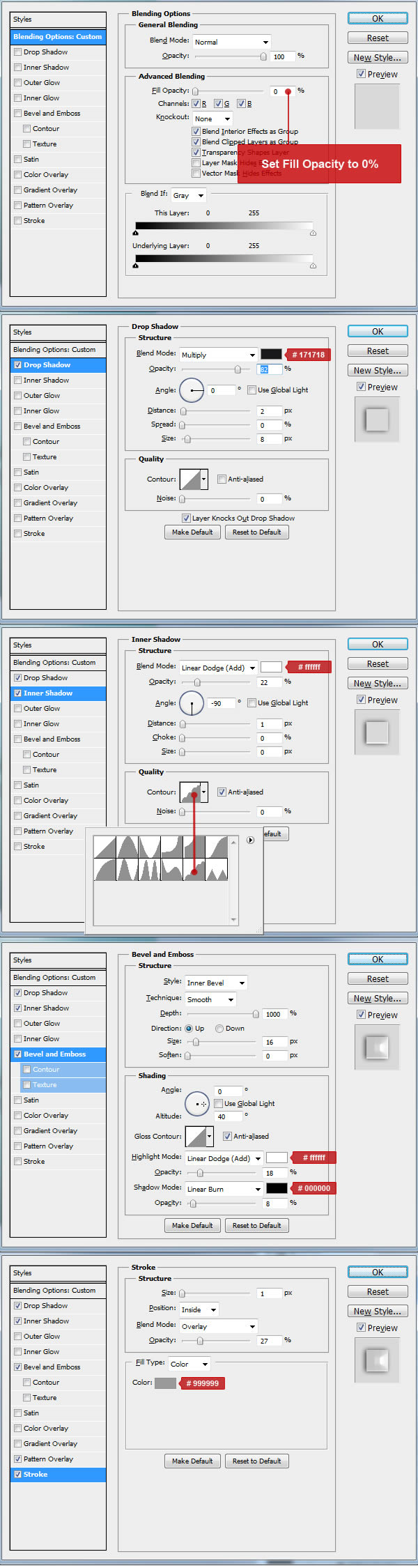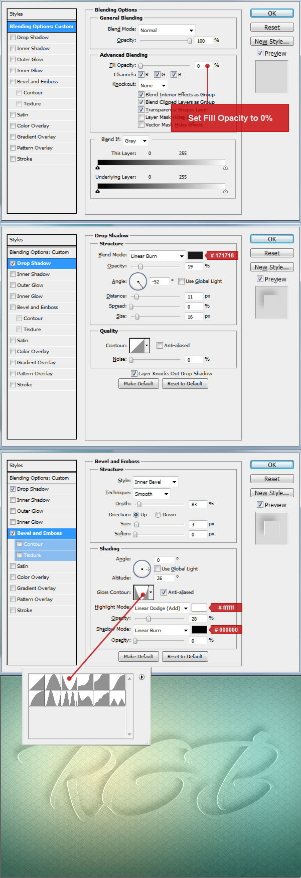 Layer này sẽ nằm dưới cùng các layer khác. Vào Menu> Layer Style> Layer> Blending Options và thiết đặt như sau.