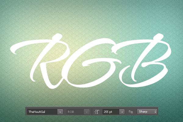Tiếp theo chúng ta tạo một layer text với tên “RGB”. Chọn công cụ type tool và chọn font The Nautigal vừa tải về, kích thước khoảng 255 pt và chế độ Sharp. Bạn có thể viết từ nào tùy ý, nhưng trong hướng dẫn này chúng ta sử dụng “RGB”.