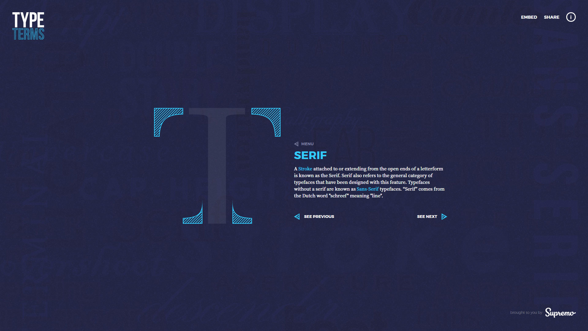 Một nguồn tài liệu tiện lợi, Tytpe Terms được tạo ra bởi Dan Heywood, Junior Designer của Supremo. “Trước khi rời khỏi trường đại học, tôi quyết định sẽ cải thiện những kiến thức của tôi về typography và tạo ra một cái gì đó có thể khiến tôi tham khảo bất kỳ lúc nào cần thiết. ” Anh ấy giải thích.