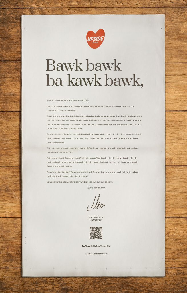 Upside Foods, nhà sản xuất gà nuôi trong phòng thí nghiệm, vừa cho đăng một quảng cáo toàn trang trên tờ The New York Times vào tuần trước với phần nội dung được viết hoàn toàn bằng “ngôn ngữ gà”, và tất nhiên, nhắm đến độc giả cũng chính là những con gà!