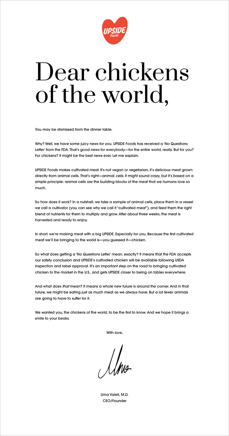 “Trong tương lai, chúng ta có thể ăn nhiều thịt như chúng ta muốn. Nhưng sẽ có ít động vật phải chịu đựng hệ luỵ từ điều đó hơn”, Uma Valeti, người sáng lập và Giám đốc điều hành của Upside Foods viết trong bức thư. “Chúng tôi muốn bạn, những con gà trên khắp thế giới, là người đầu tiên được biết đến điều này. Và chúng tôi hy vọng nó sẽ mang lại nụ cười trên mỏ của các bạn.”