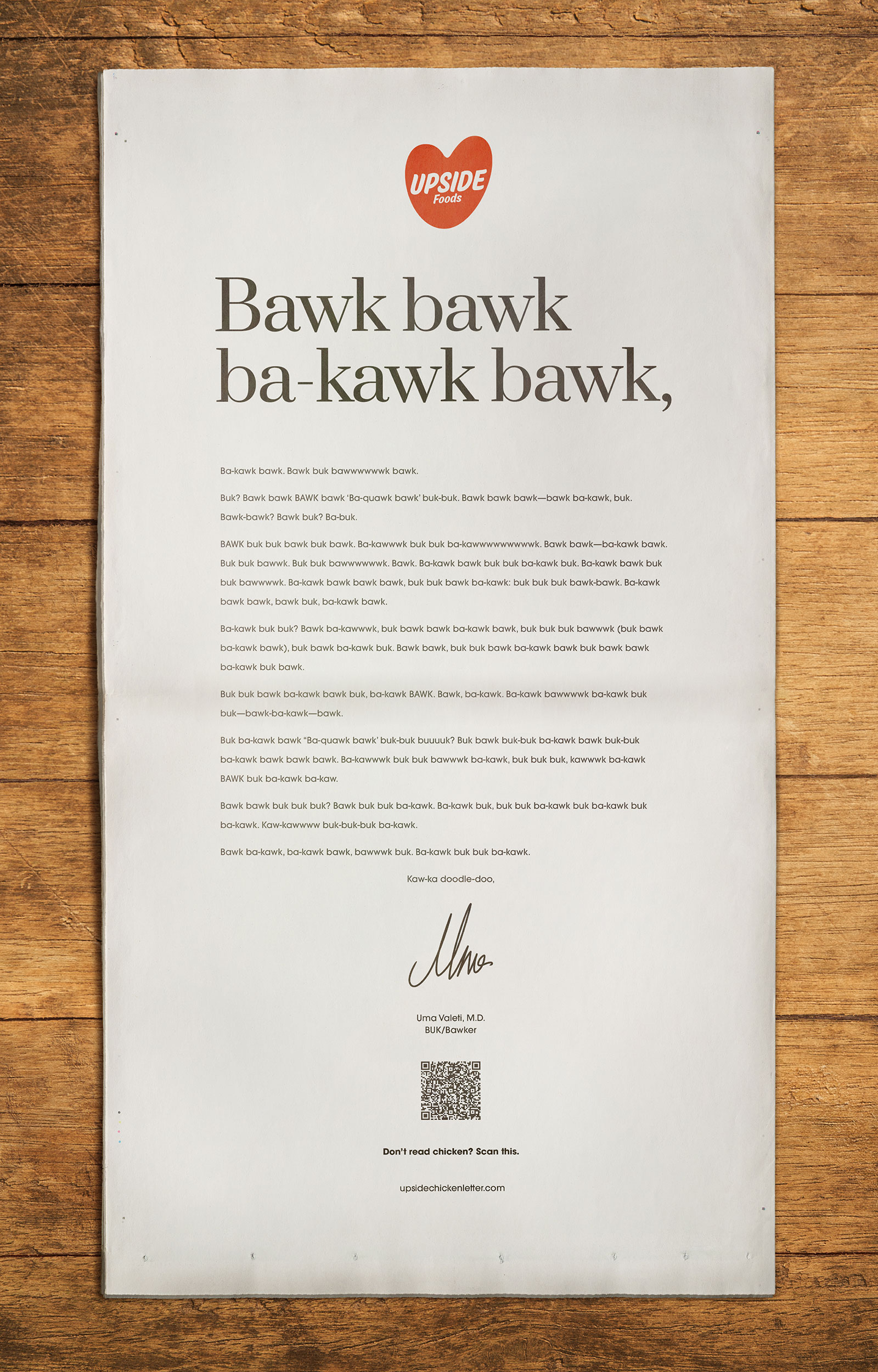 Upside Foods, nhà sản xuất gà nuôi trong phòng thí nghiệm, vừa cho đăng một quảng cáo toàn trang trên tờ The New York Times vào tuần trước với phần nội dung được viết hoàn toàn bằng “ngôn ngữ gà”, và tất nhiên, nhắm đến độc giả cũng chính là những con gà!