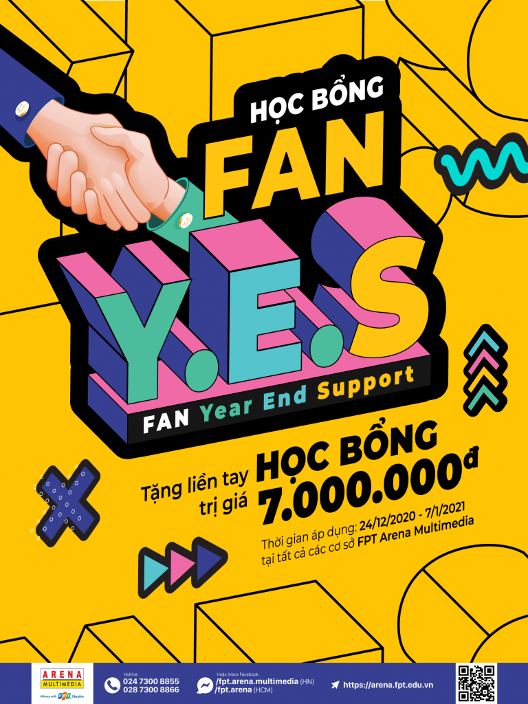 Với FAN Y.E.S, các tân sinh viên sẽ được tặng liền tay Học bổng trị giá 7.000.000đ và sẽ được trừ trực tiếp vào học phí. Trong đó 4.000.000đ sẽ dành cho học kỳ 1 và 3.000.000 sẽ được trừ vào học phí kỳ 2.