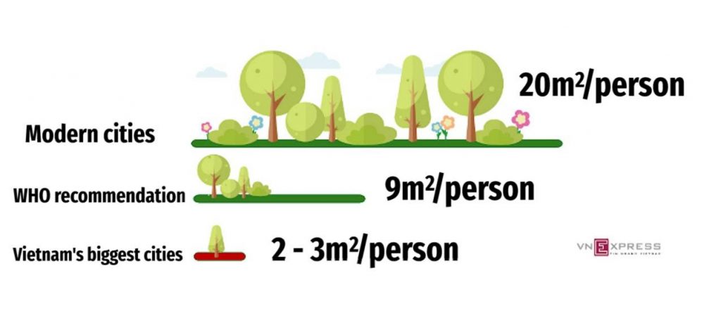 Thêm vào đó, số lượng mảng xanh cùng không gian chung ở Việt Nam đang dần bị thu hẹp lại nhường chỗ cho các dự án xây dựng cơ sở hạ tầng. Chỉ xét riêng về mật độ cây xanh, trung bình người dân ở các thành phố lớn như Hồ Chí Minh, Hà Nội chỉ được cung cấp từ 2-3 m2 mảng xanh, thấp hơn rất nhiều so với con số 9m2/ người mà WHO khuyến cáo là cần thiết để được sống khoẻ mạnh và cân bằng. Đa phần các đô thị lớn trên thế giới đều đảm bảo mỗi người dân có trên 20 m2/ mảng xanh, con số này ở Singapore và Seul lần lượt là 30.3/m2/người và 41/m2/người. Ở Vienna, số liệu còn được ghi nhận lên tới 120/m2/người.