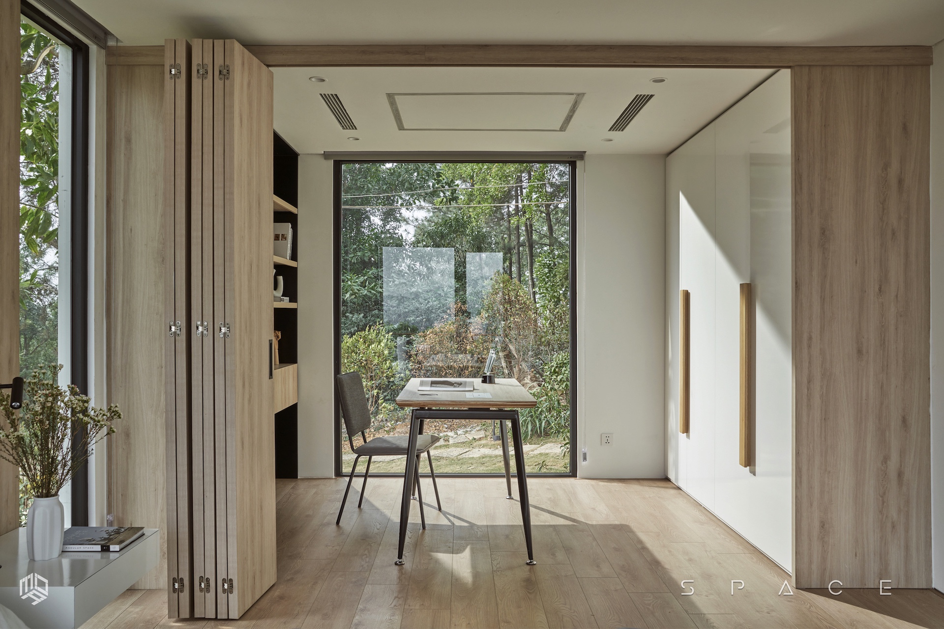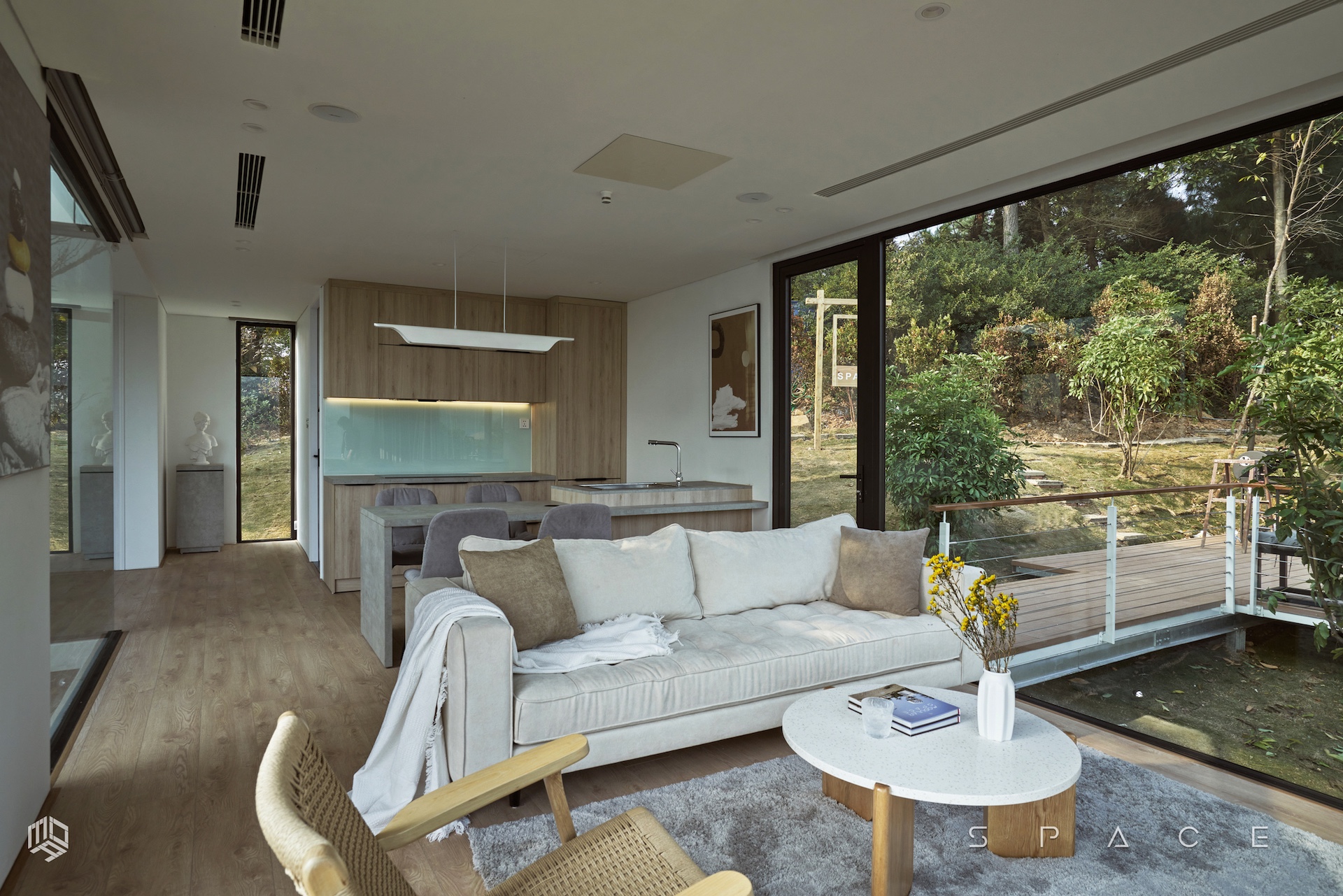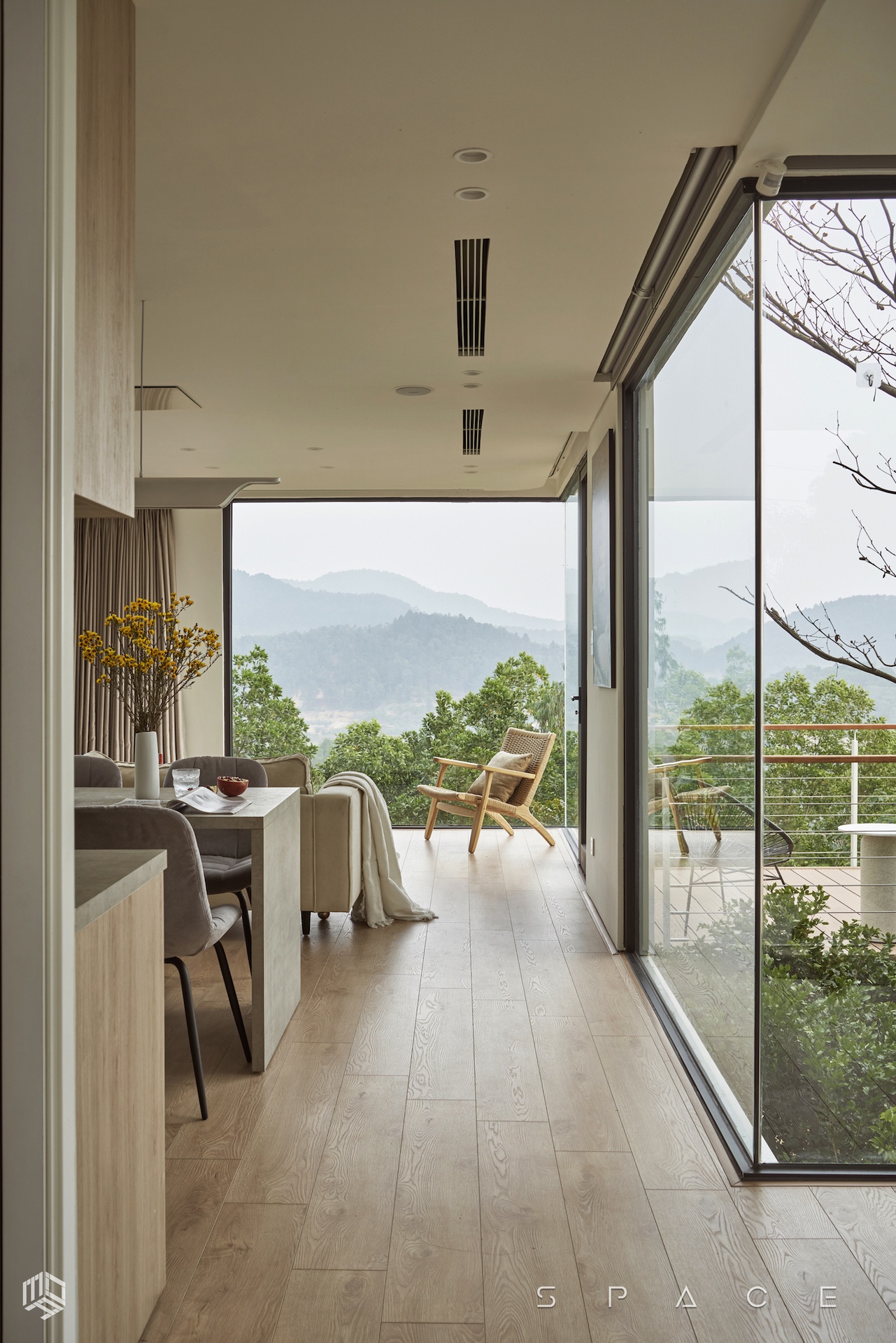 Với diện tích hơn 75m2, Vallée des fleurs là căn nhà đầy tiện nghi được đặt ngay trên ngọn đồi tọa lạc tại vùng núi Minh Trí – Sóc Sơn hoang sơ. Căn nhà được thiết kế lấy cảm hứng từ phong cách Minimalism, tối giản hóa mọi thứ mang đến một vẻ đẹp tinh tế nhưng không hề kém tiện nghi. Với mong muốn tận dụng tối đa khung cảnh thiên nhiên, không gian được bố trí nhiều khung kính lớn với tầm view rộng hướng thẳng ra phía hồ Ban Tiện và sân golf Minh Trí.