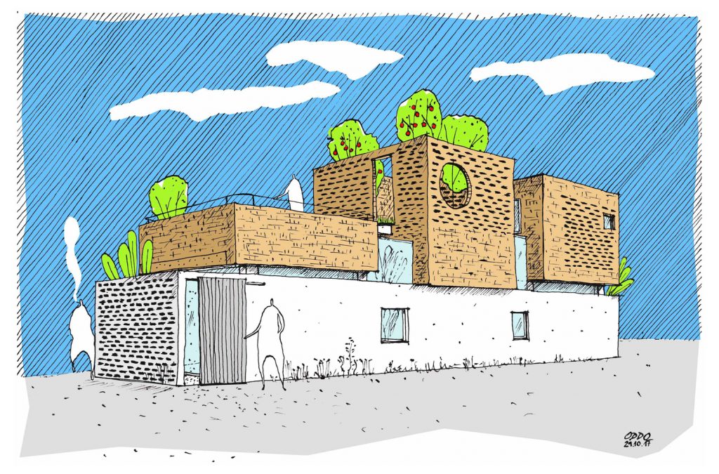 Do kinh phí xây dựng rất thấp, ngôi nhà được thiết kế bằng vật liệu địa phương rẻ tiền như gạch. Để giảm mức tiêu thụ điện của hệ thống điều hòa không khí, ngôi nhà được thiết kế để thông gió chéo tự nhiên.
