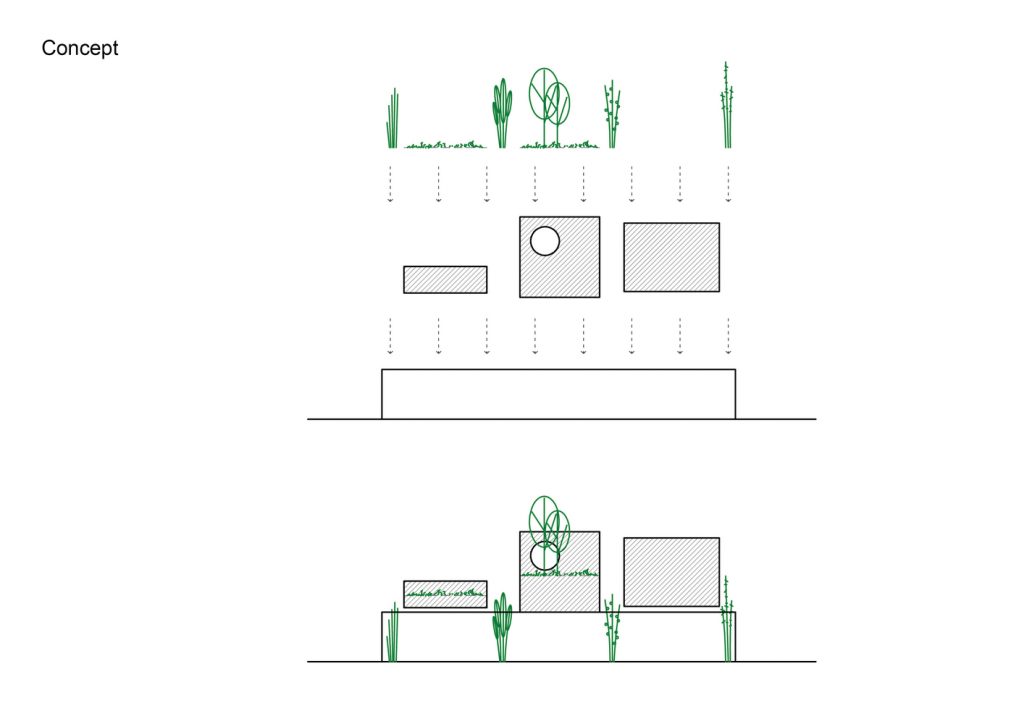 Được lấy cảm hứng từ ngôi nhà ống truyền thống, có cân nhắc các yếu tố kiến trúc đương đại phản ánh phong cách sống hiện đại. Ngôi nhà ống truyền thống được thiết kế với các khoảng sân mở ở giữa bố trí cho phép luồng không khí và ánh sáng tự nhiên lan tỏa khắp ngôi nhà, lý tưởng với khí hậu cận nhiệt đới của địa phương. Một không gian sống liên hoàn được phân chia bởi những khoảng sân xanh nhỏ bên ngoài và bên trong. Khu vực mái được bao phủ bởi các khu vườn mở, nơi gia đình có thể tự trồng rau và trái cây.