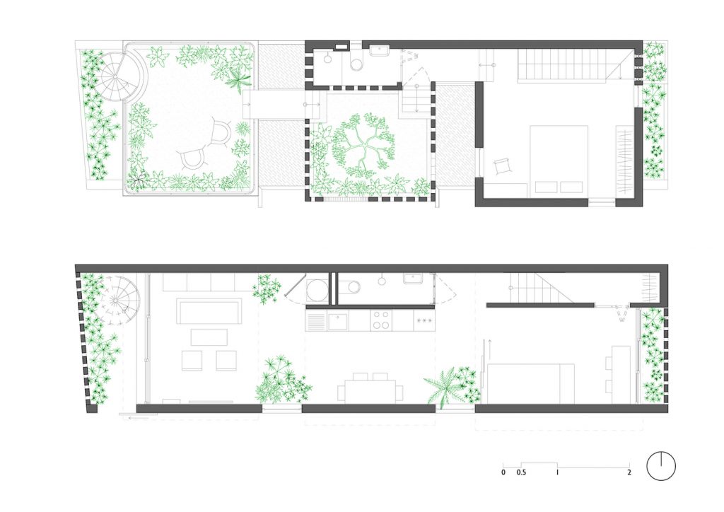 Thửa đất của ngôi nhà tương đối hẹp chỉ 4,1m. Mục đích là tạo ra một không gian mở thông thoáng ở tầng trệt để người ở có cảm giác rộng rãi về không gian dù là một ngôi nhà nhỏ. Vì thế thay vì dùng các bức tường., nhóm KTS để các loại cây và thực vật có chức năng phân chia không gian một cách trực quan.